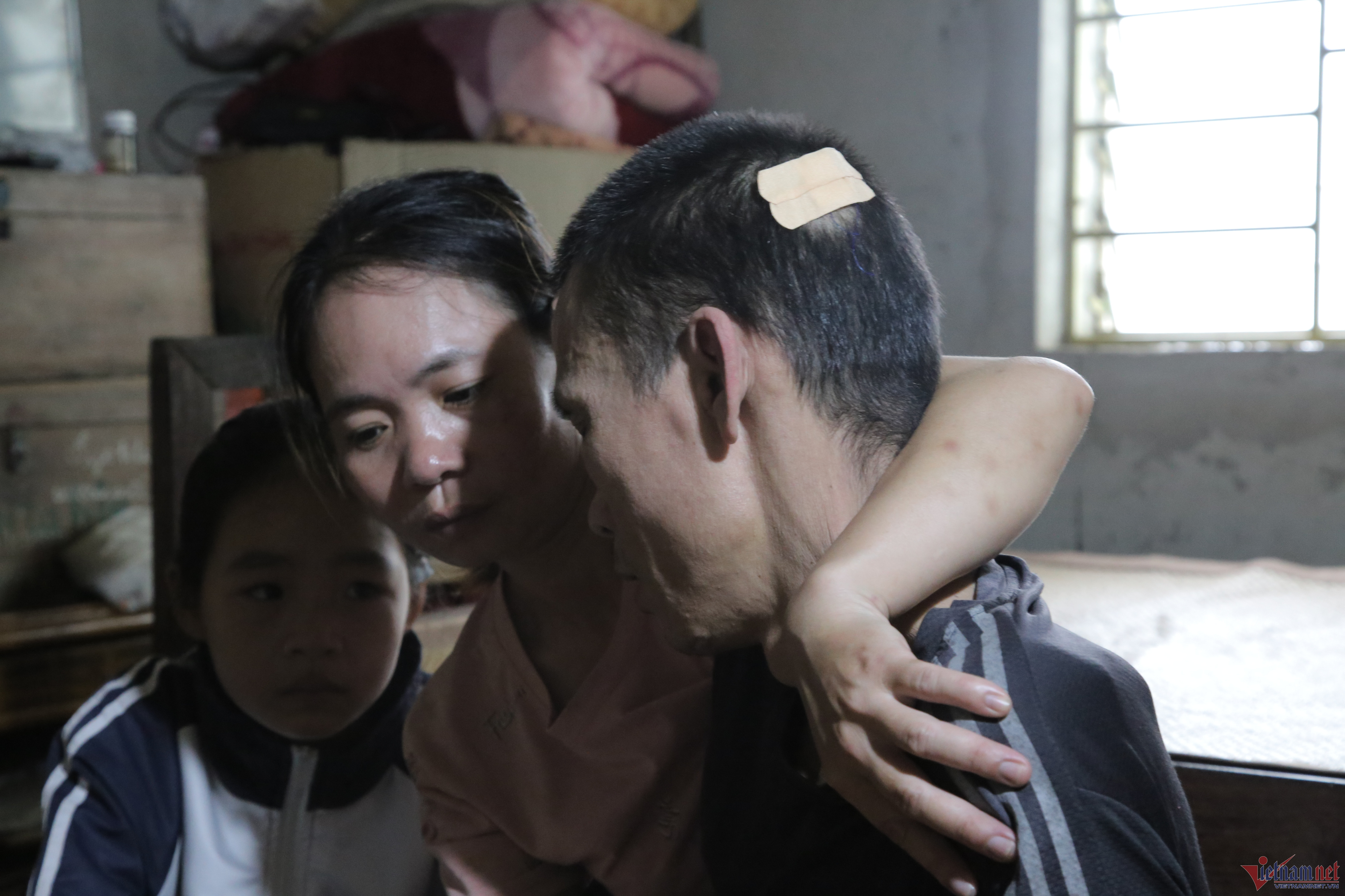 "Sau khi sinh Hà được 3 tháng thì anh ấy mắc bệnh. Để có tiền chạy chữa cho chồng, tôi phải bán hết tài sản mà trước đây tích góp được và vay nợ thêm, nhưng bệnh của chồng không cải thiện. Giờ tôi phải bỏ bê hết công việc để về chăm sóc anh, hằng ngày phải ngồi canh, bởi khi lên cơn phải có người ở bên cạnh nếu không sẽ đập đầu xuống đất chảy máu và rất nguy hiểm. Lúc anh lên cơn, cắn vào người tôi thâm tím, đau lắm nhưng tôi cũng phải chịu đựng", chị Tú Anh xót xa nói.