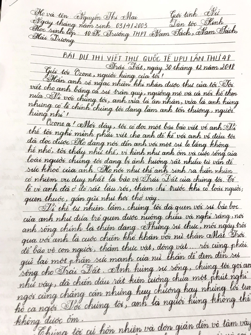 Tham gia dự thi cuộc thi Viết thư quốc tế UPU lần thứ 48 với đề tài "Hãy viết một bức thư về người hùng của em", học sinh Nguyễn Thị Mai (lớp 10K, Trường THPT Nam Sách, Hải Dương) đã lựa chọn viết cho người hùng của mình là tầng Ozon.
