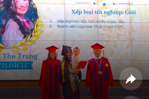 “Em Nguyễn Thu Trang đạt tổng điểm trung bình chung tích lũy là 3,21; xếp loại Giỏi (từ 3,2 trở lên). Nữ sinh sinh con vào đúng đợt hè năm thứ hai, khi đã thi xong hết các môn. Lúc bầu và giai đoạn đầu sinh nở lại rơi vào thời gian các trường đại học, học viện tổ chức dạy học trực tuyến nên khá thuận lợi, không cần đến thời gian bảo lưu. Vì thế, em Trang có thể vừa học vừa được gia đình chăm sóc sức khỏe ở nhà”, bà Hà nói.