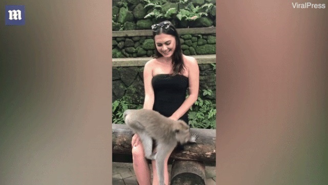 Nữ du khách xinh đẹp bị chú khỉ tinh ranh kéo váy làm lộ ngực