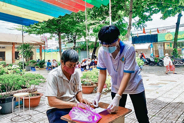 | Đội tình nguyện của Thoa chuẩn bị cơm cho bệnh nhân. |
