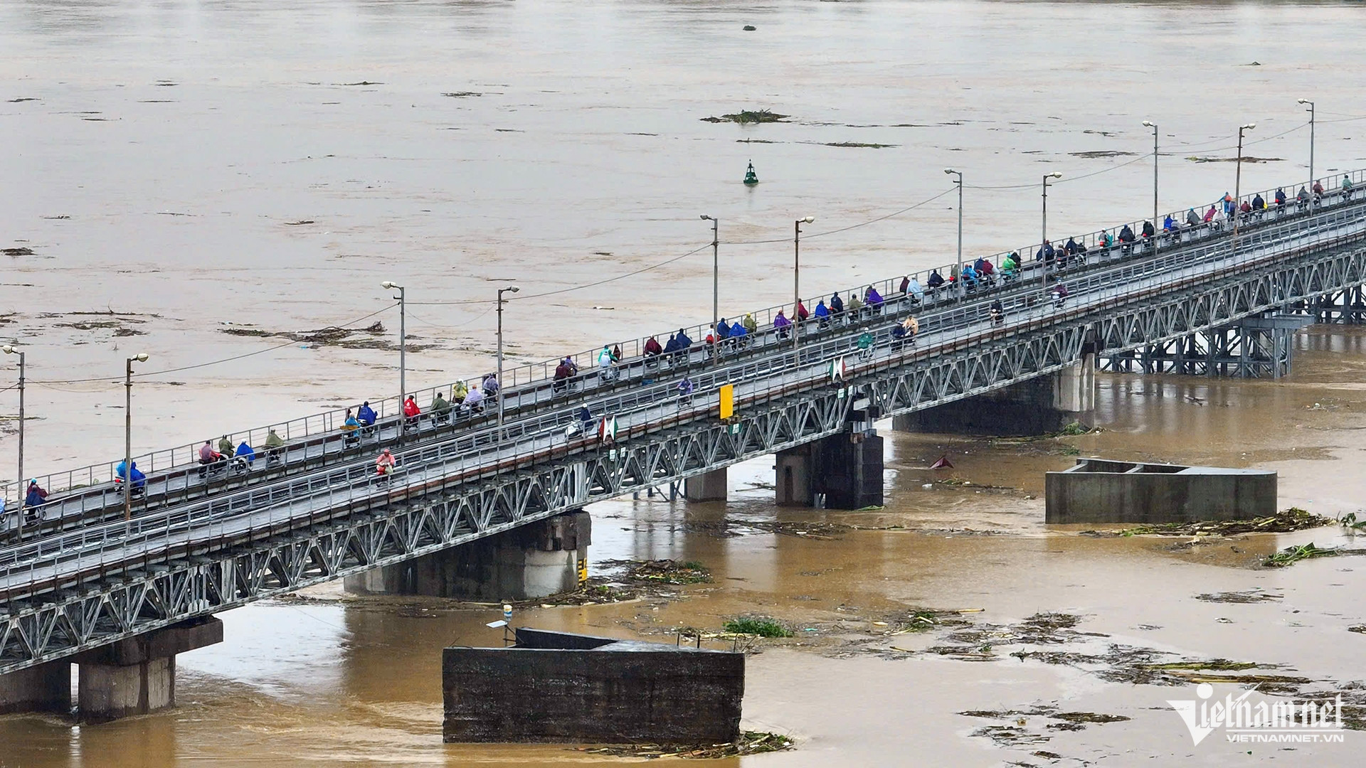 Dòng nước chảy xiết bên mố trụ cầu có thể nhìn thấy khá rõ. Dự báo nước sông Hồng tại hạ lưu sẽ còn lên cao hơn nhiều nữa.