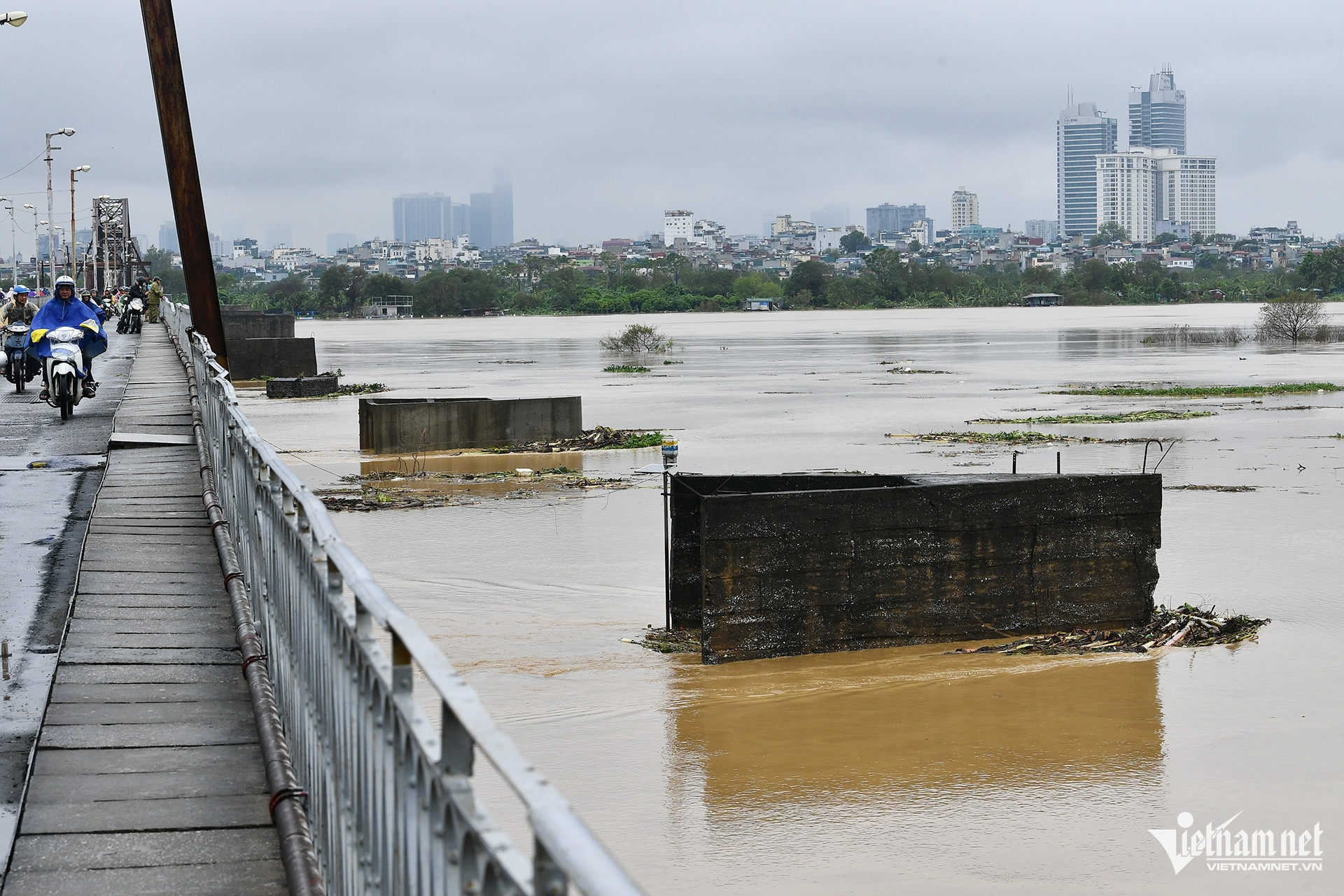 Tại khu vực cầu Long Biên, nước sông dâng cao kỷ lục. Hình ảnh này hiếm khi xuất hiện trong nhiều năm trở lại đây.