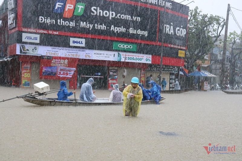 Lũ từ thượng nguồn đổ về cộng với mưa lớn ở hạ du khiến TP Huế và các huyện, thị vùng ven tiếp tục ngập sâu trong lũ.