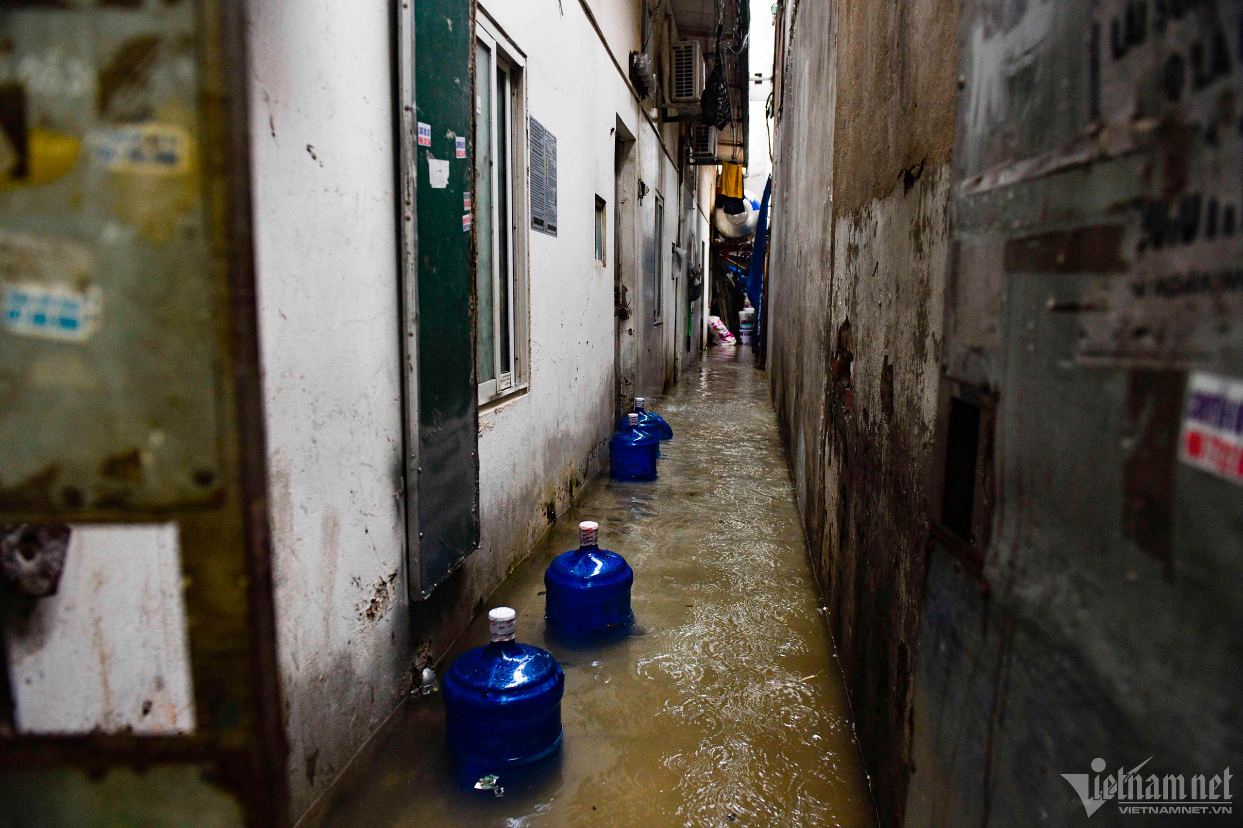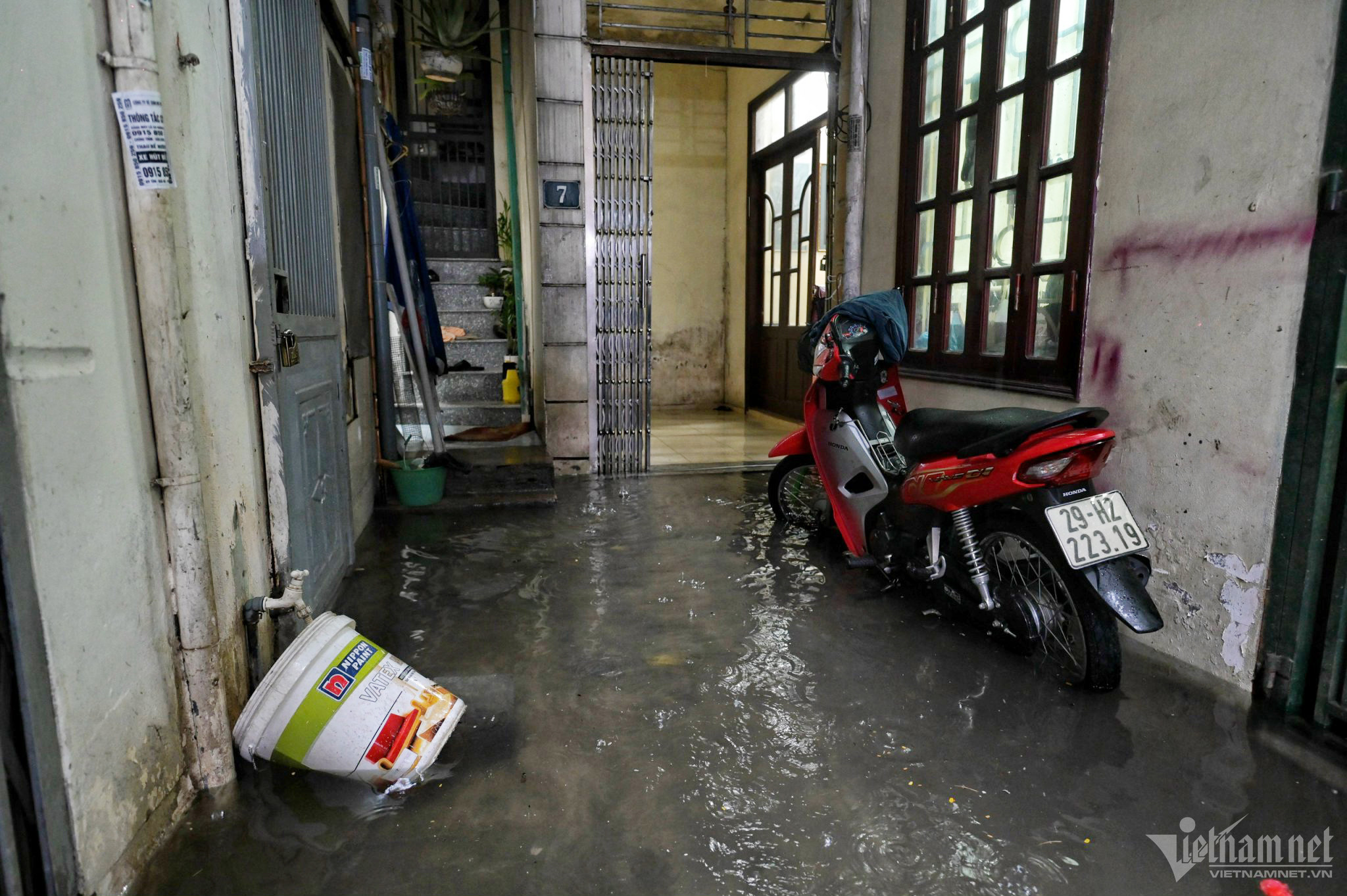 Nước tràn vào mọi ngóc ngách của con ngõ, may mắn chỉ mới lênh láng mặt sàn.