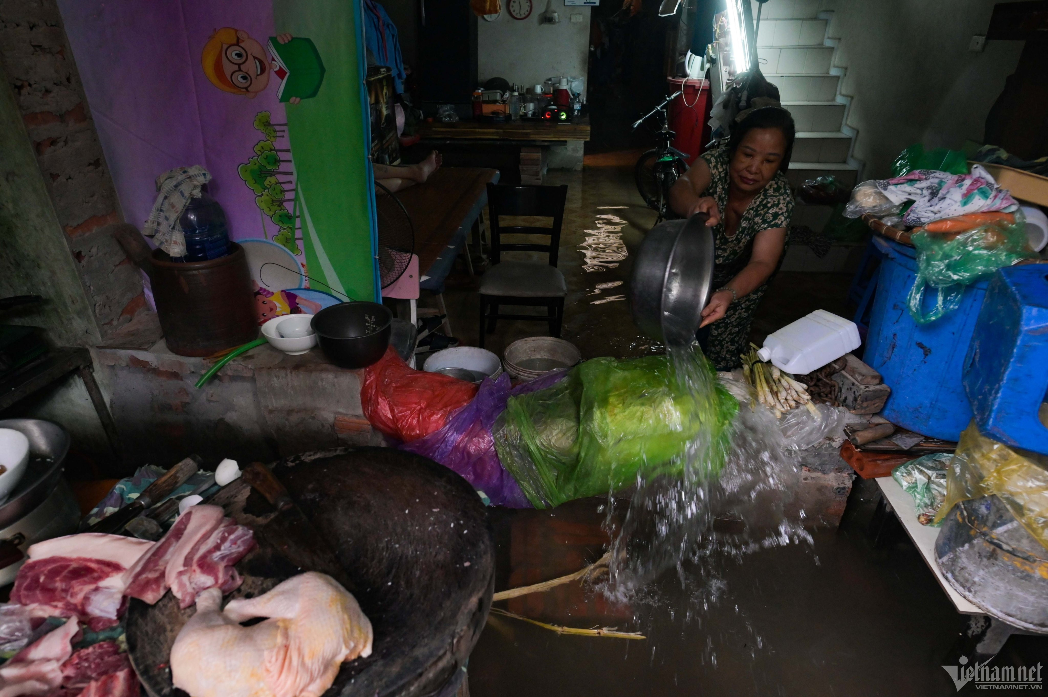 Tầng 1 nhà ông Chính ở ngõ 90 Đội Cấn cũng đã được ngắt điện. Cả gia đình sinh hoạt ở trên cao, không nấu nướng. Gần trưa, ông lội nước đi mua cơm về cho cả nhà.