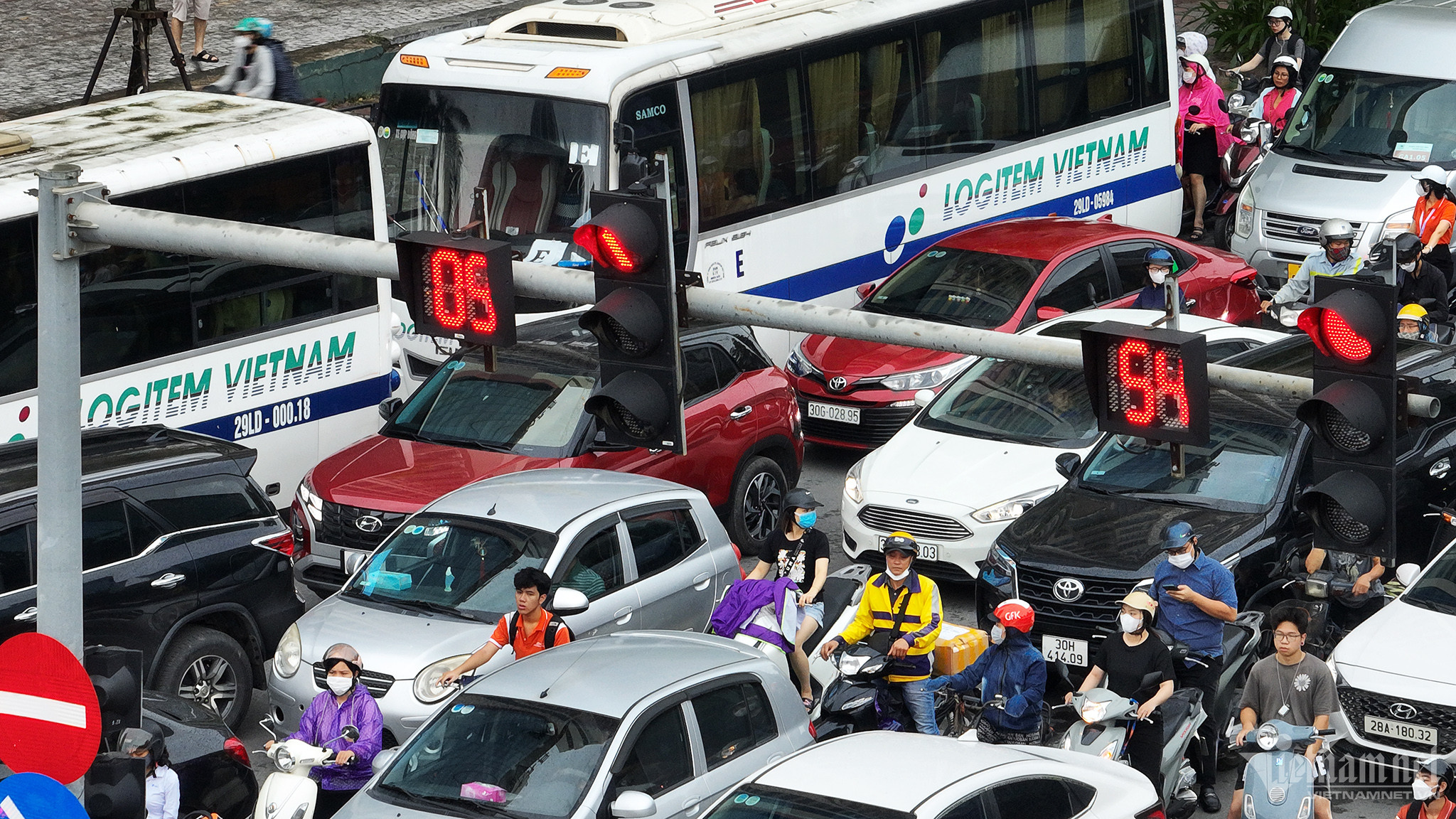 Việc phải dừng chờ đèn tín hiệu vào giờ đi làm buổi sáng phía sau hàng trăm phương tiện khác khiến nhiều người đi xe máy sốt ruột. Họ thường không chịu đợi mà phải chen lên cho nhanh. Trong ảnh, khi hướng đường Lê Đức Thọ đèn chưa kịp chuyển màu đỏ, những người từ phố Hàm Nghi đã vội băng lên lao qua, cùng lúc đó hai hướng còn lại cũng phóng và rẽ vào các chỗ trống, dẫn đến tình cảnh xe nọ chắn xe kia, đi không nổi. Rơi vào tình cảnh này, những người muốn nghiêm chỉnh chấp hành luật giao thông cũng không dễ.