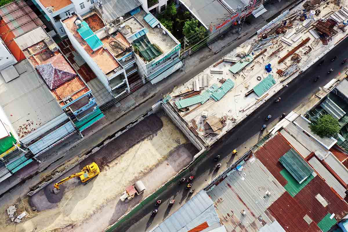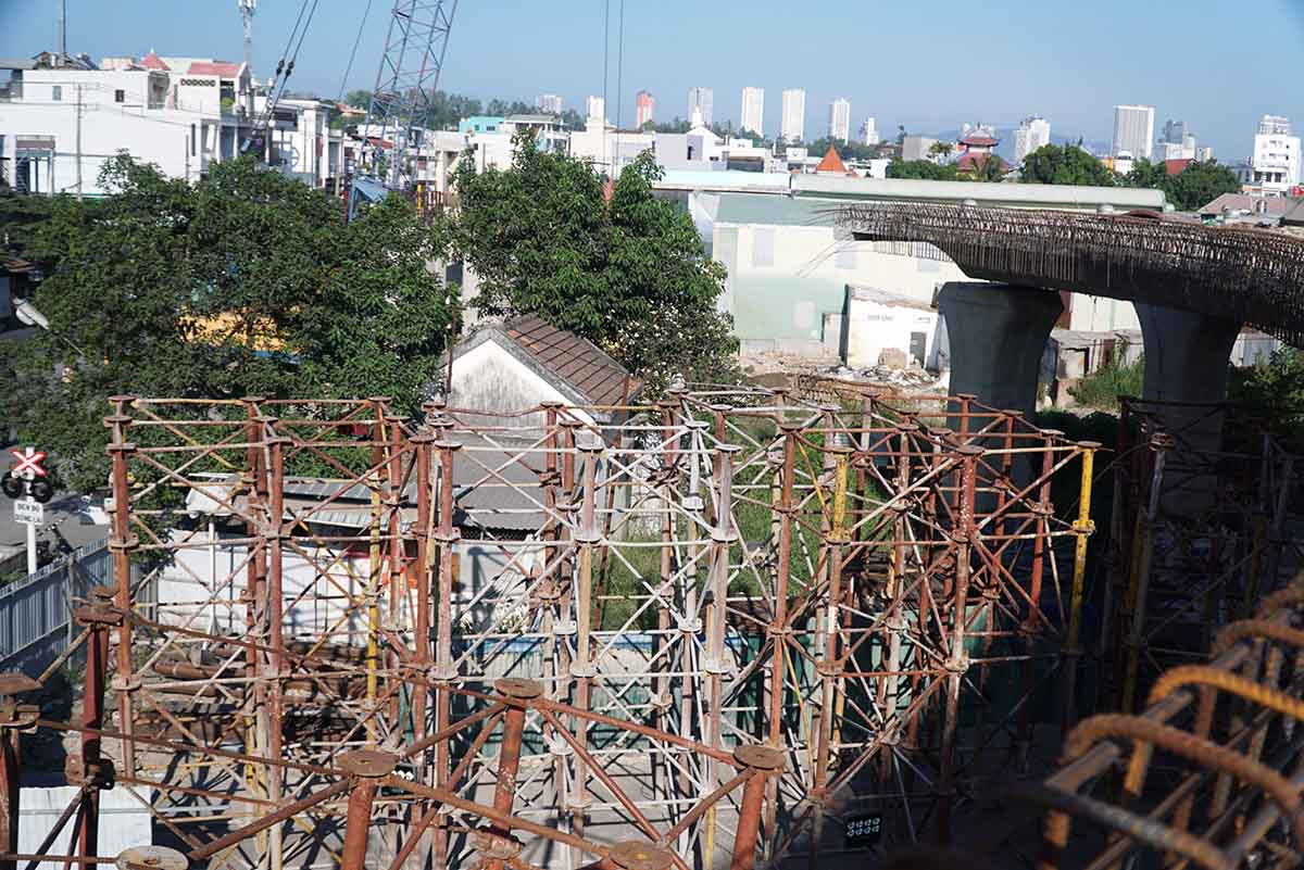 Đến nay, sau hơn bốn năm thi công, công trình vẫn ngổn ngang, xung quanh có nhiều rào chắn, tôn, thu hẹp lòng đường, khiến giao thông khu vực này thường xuyên ùn tắc vào giờ cao điểm, giờ tàu chạy qua. Hàng loạt giàn giáo, sắt bị rỉ sét vì lâu ngày không sử dụng.