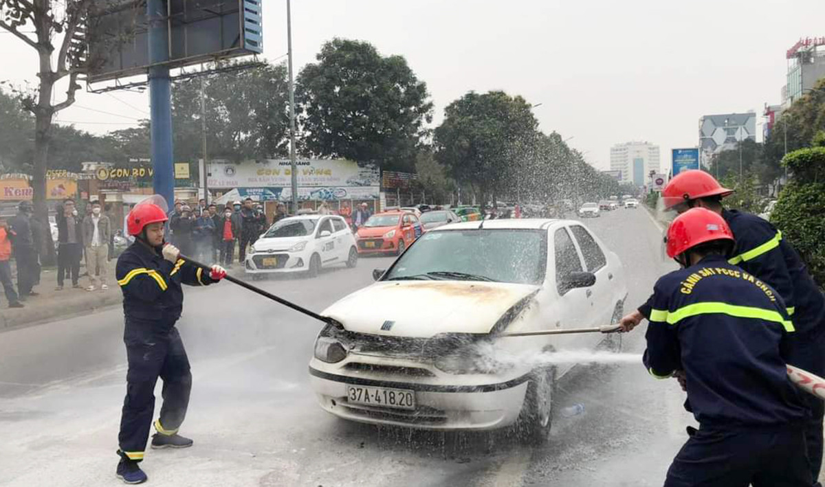 Tài xế vội mở cửa thoát ra ngoài. Người dân xung quanh đã mang bình cứu hỏa đến dập lửa.