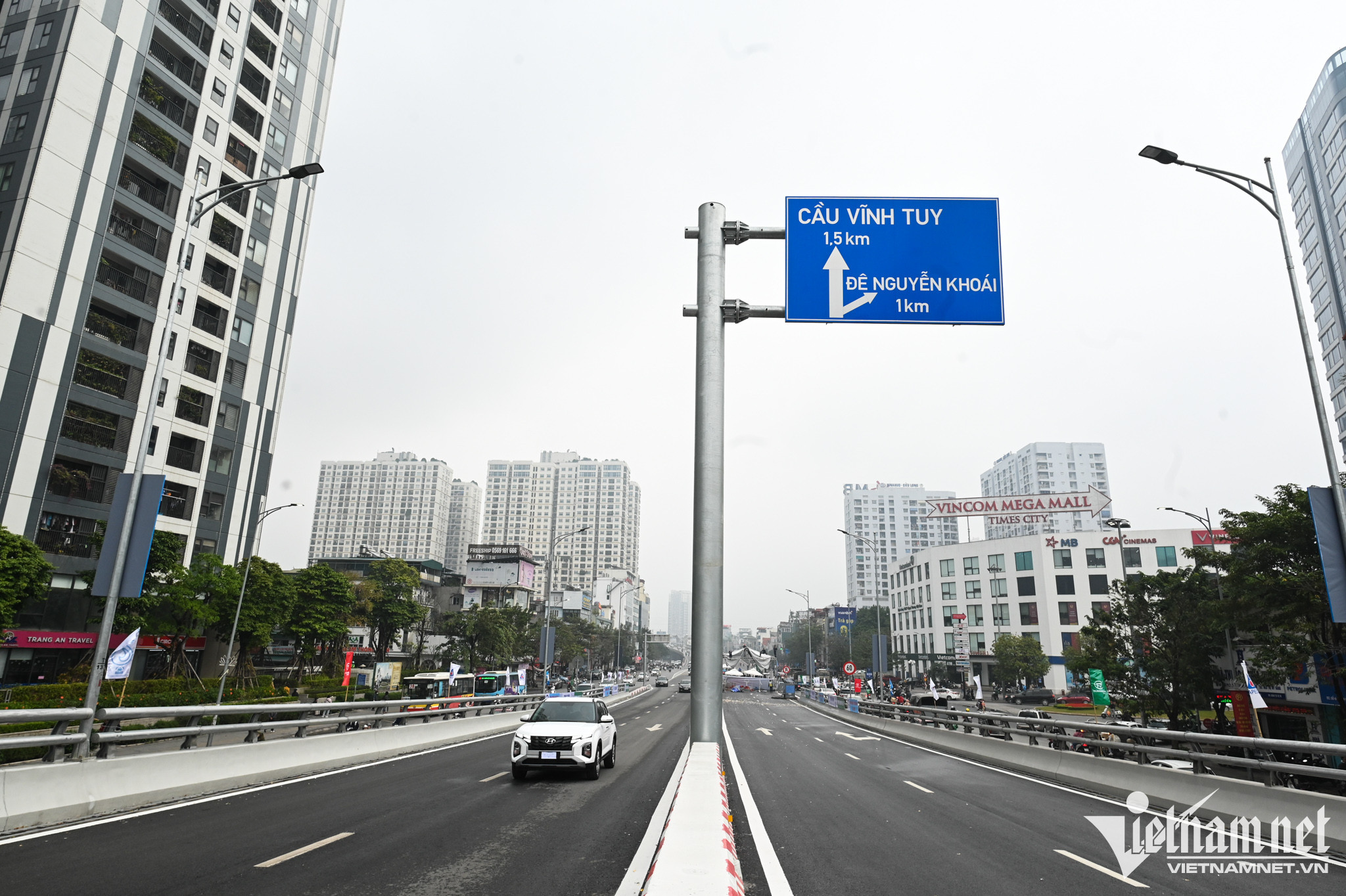 Phía nhánh lên đường trên cao hướng Ngã Tư Vọng đi Vĩnh Tuy vẫn được rào chắn, chưa đưa vào sử dụng trong sáng 11/1. Việc thông xe xuyên suốt đường vành đai 2 Vĩnh Tuy - Ngã Tư Sở sẽ góp phần giảm tải cho các điểm nóng ùn tắc giao thông lân cận đã nhiều năm qua.