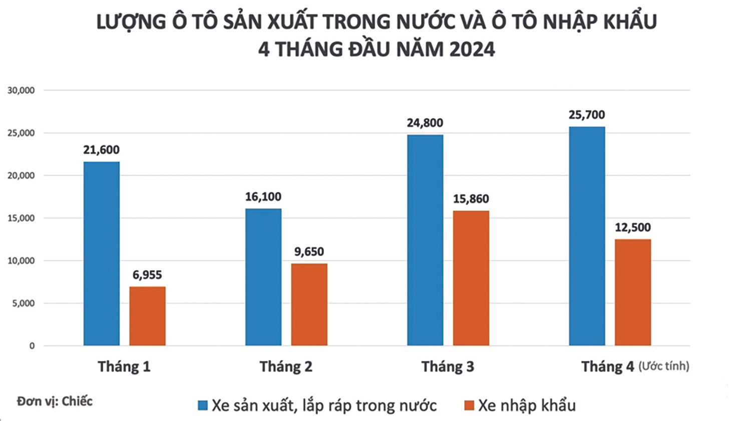 Theo số liệu của Tổng cục Thống kê, sản lượng ô tô sản xuất lắp ráp trong nước 4 tháng đầu năm 2024 ước đạt 88.300 chiếc, con số này thấp hơn so với 109.500 chiếc của 4 tháng đầu năm 2023 và thấp hơn nữa so với 151.000 chiếc của 4 tháng đầu năm 2022. Như vậy cũng có nghĩa là sản xuất lắp ráp ô tô trong nước đang thụt lùi. So với 4 tháng đầu năm 2022, sản lượng ô tô sản xuất lắp ráp 4 tháng đầu năm 2024 giảm hơn 60.000 chiếc.