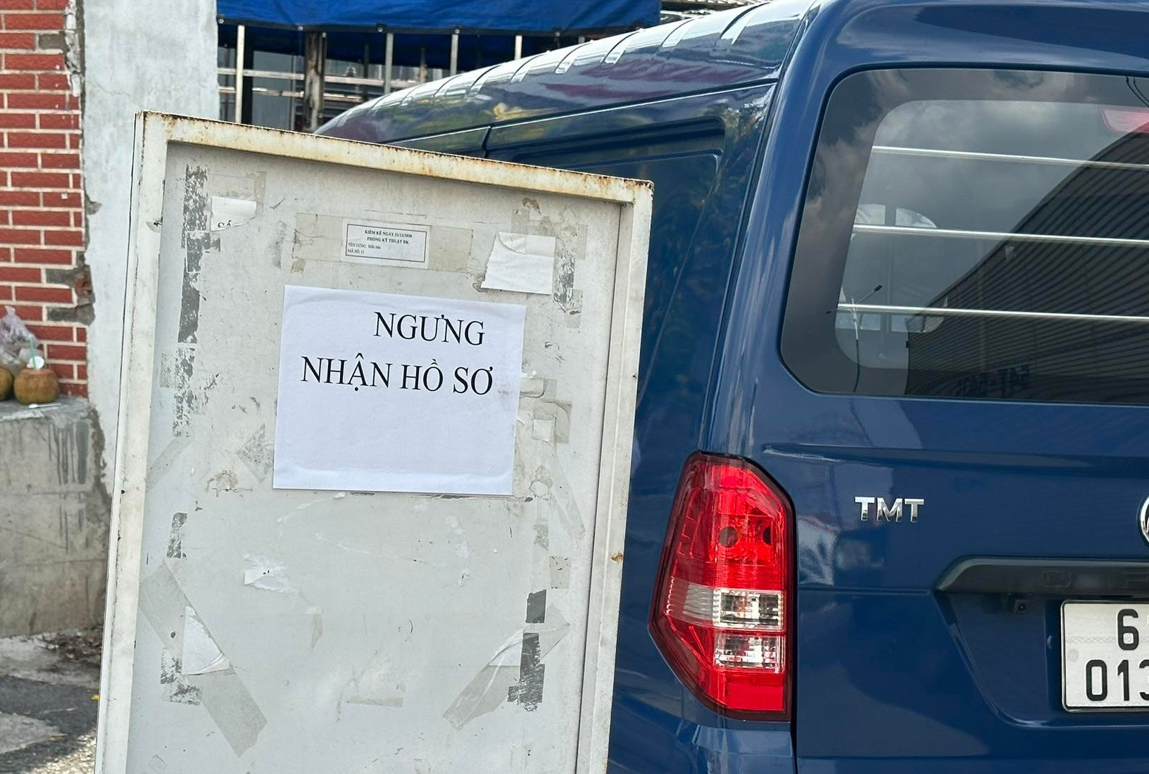 Lượng xe quá đông khiến trung tâm này phải dán bảng thông báo ngưng nhận hồ sơ để hạn chế phương tiện xếp hàng dài gây ùn tắc giao thông.