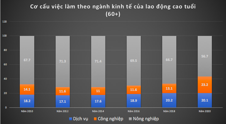 Lao động là NCT chủ yếu làm trong khu vực phi chính thức và ngành nông - lâm - thuỷ sản, chất lượng việc làm thấp, thu nhập chỉ bằng 38,5% mức lương bình quân trên thị trường. Phần lớn NCT hiện nay tham gia lao động với vị thế của lao động dễ tổn thương.