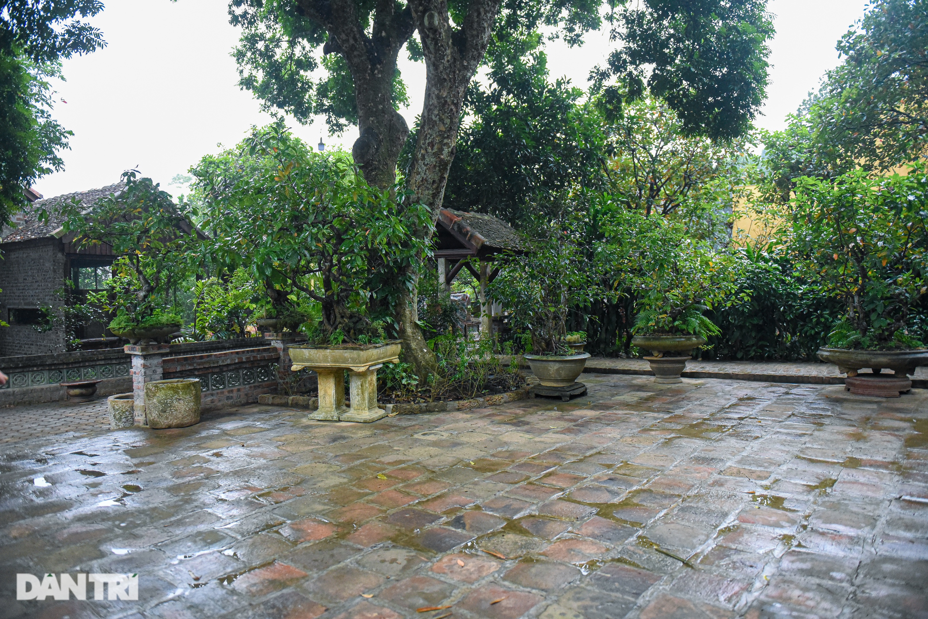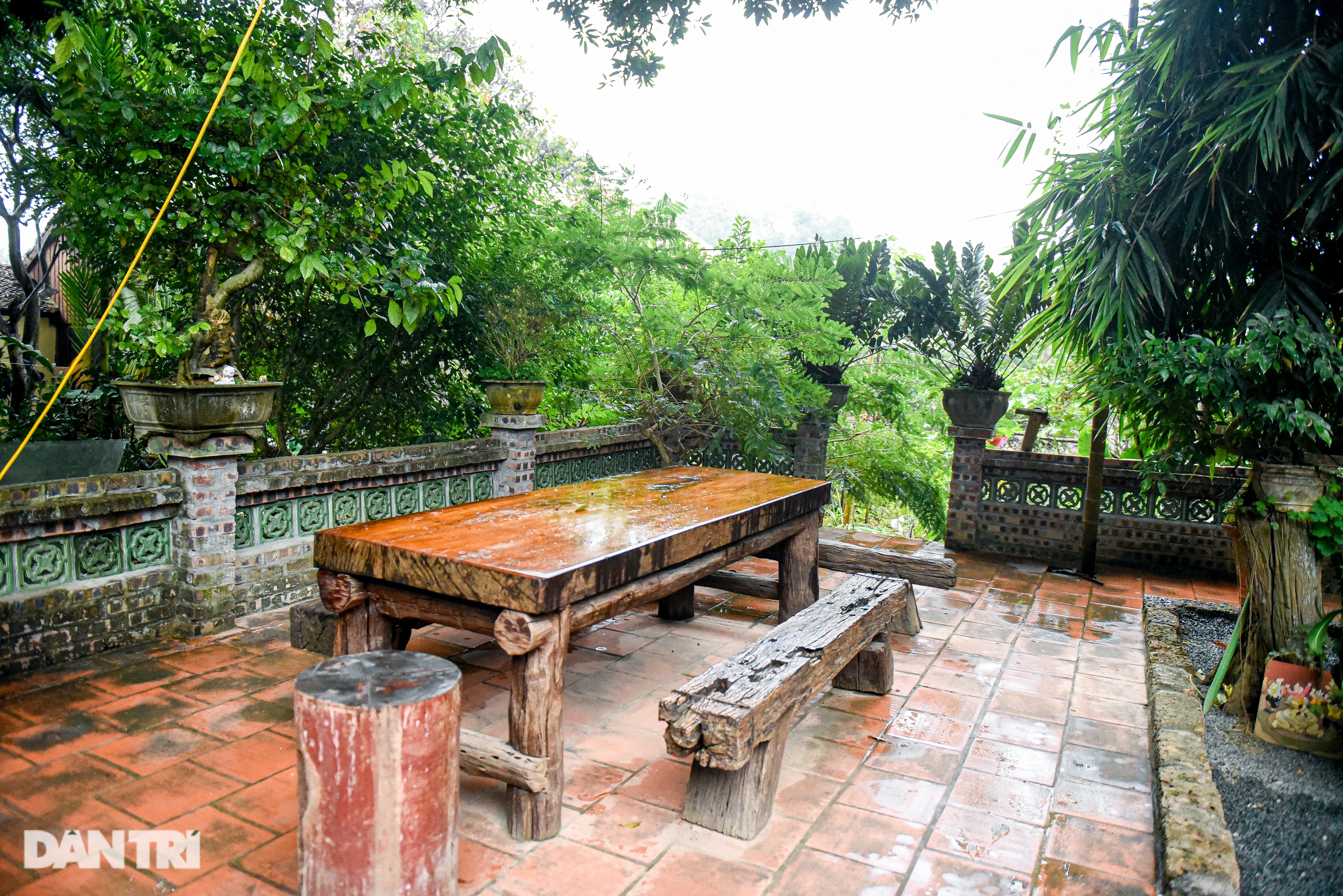 Một góc sân được anh Kiên lát từ gạch cổ đã qua sử dụng.