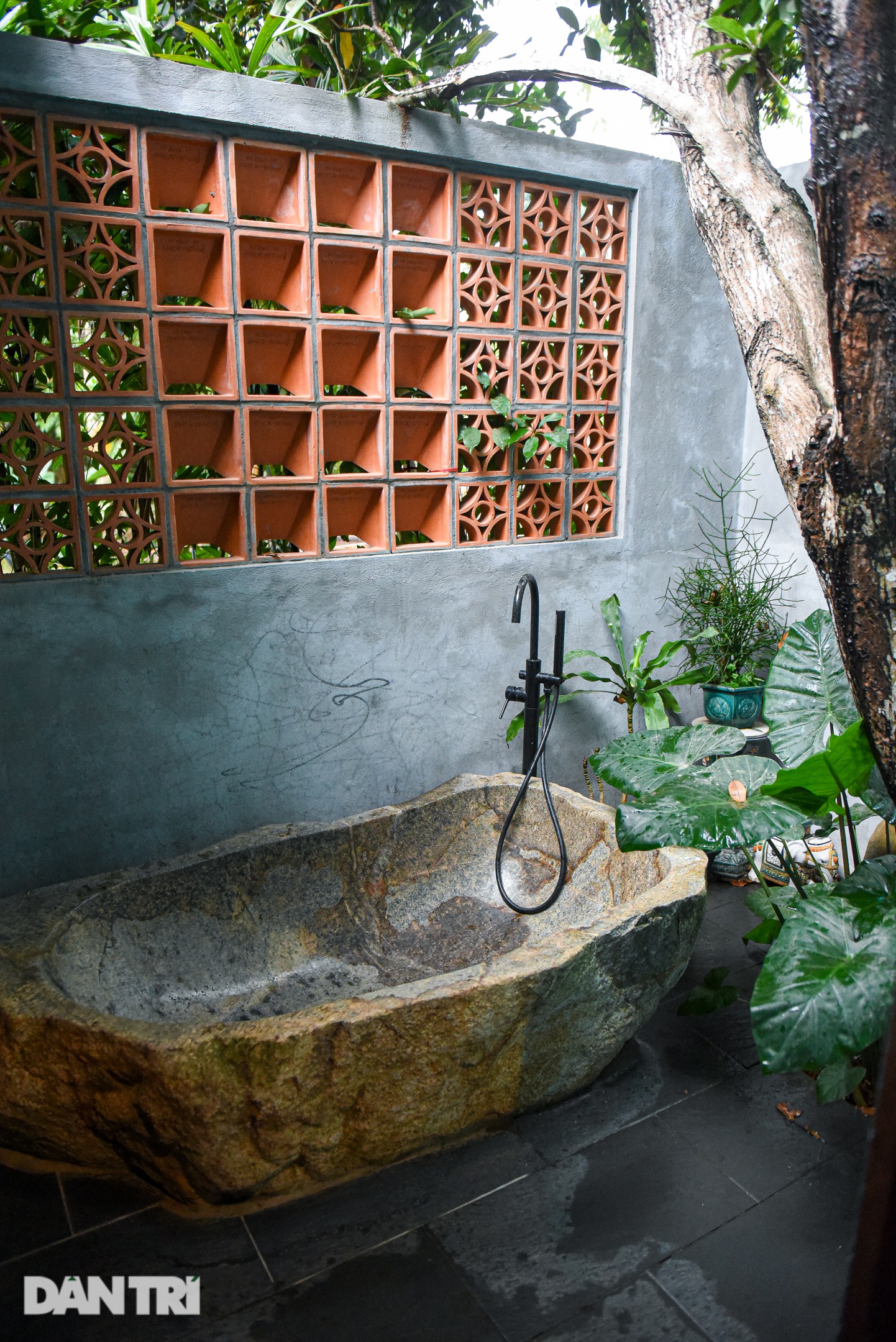 Khu vực phòng tắm hiện đại nối liền với một phòng tắm "lộ thiên". Từ đây, gia chủ có thể vừa ngâm mình thư giãn trong bồn tắm đá vừa nghe chim hót, ngắm ánh nắng xiên qua hàng cây.