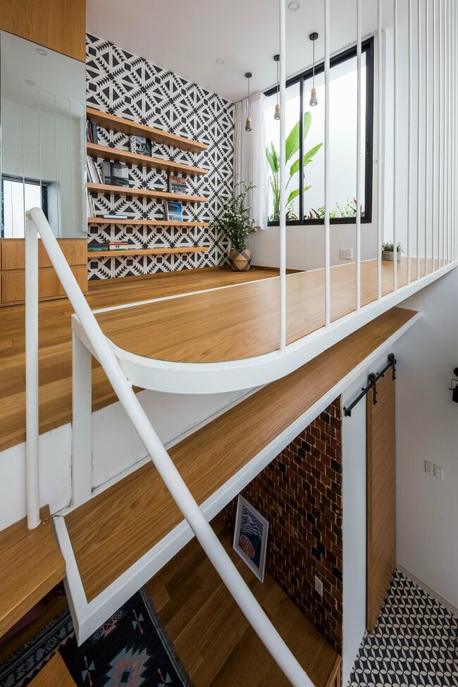 Cầu thang nhỏ và khoảng thông tầng giúp gắn kết 2 khu vực với nhau.
