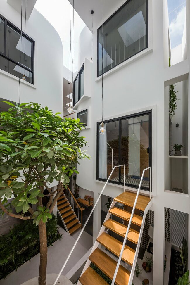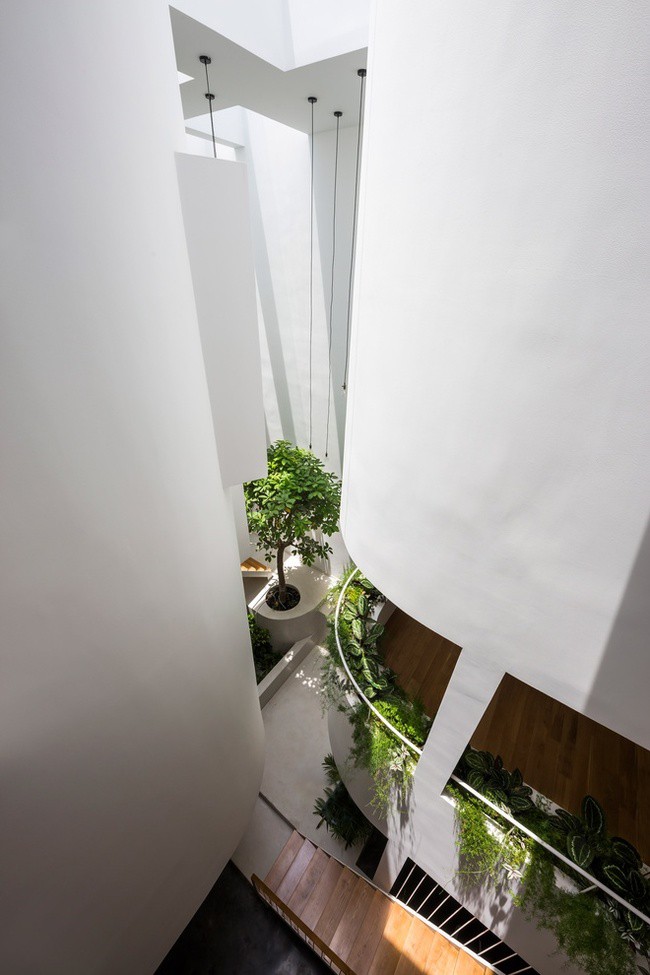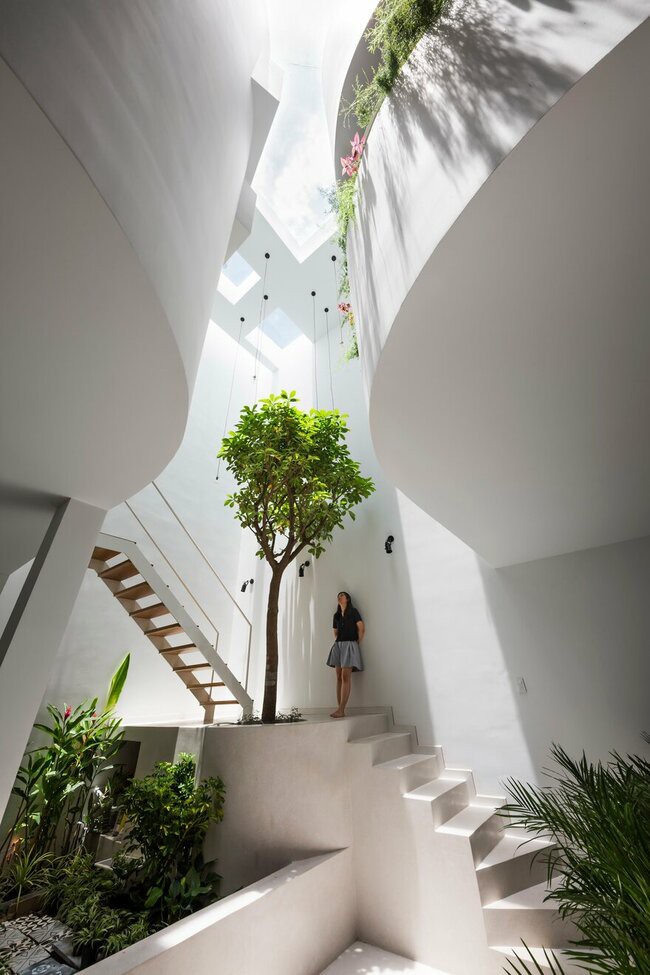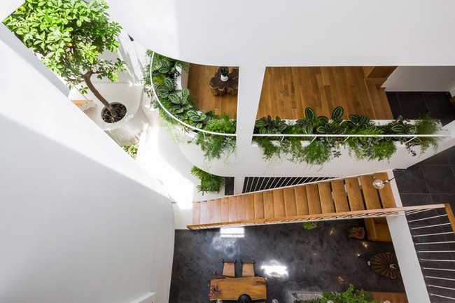 Các kĩ sư tận dụng ánh sáng tự nhiên và cây xanh, không chỉ để lấp đầy các khoảng trống kiến trúc bên trong ngôi nhà mà còn tô điểm cho các bức tường trắng bên trong của giếng trời.