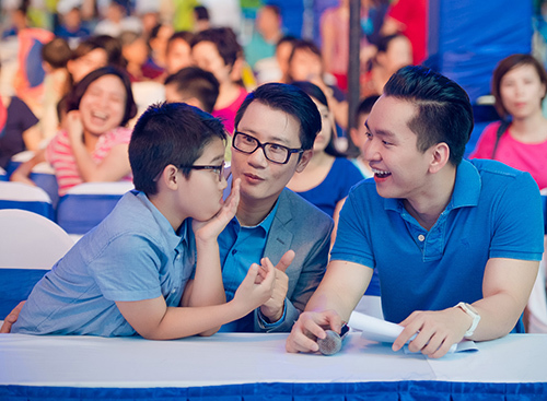 Cậu bé Tê giác của "Bố ơi, mình đi đâu thế" đã cùng nam ca sỹ Hoàng Bách tham dự một sự chiều qua tại Hà Nội.