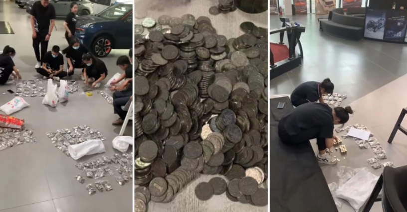Cô Chen, một trong những nhân viên tại đại lý ô tô cho biết người đàn ông làm nghề kinh doanh bột mì. Ông ấy đã mang 10 chiếc túi chứa đầy tiền xu đến cửa hàng để mua một chiếc ô tô cho con trai mình.