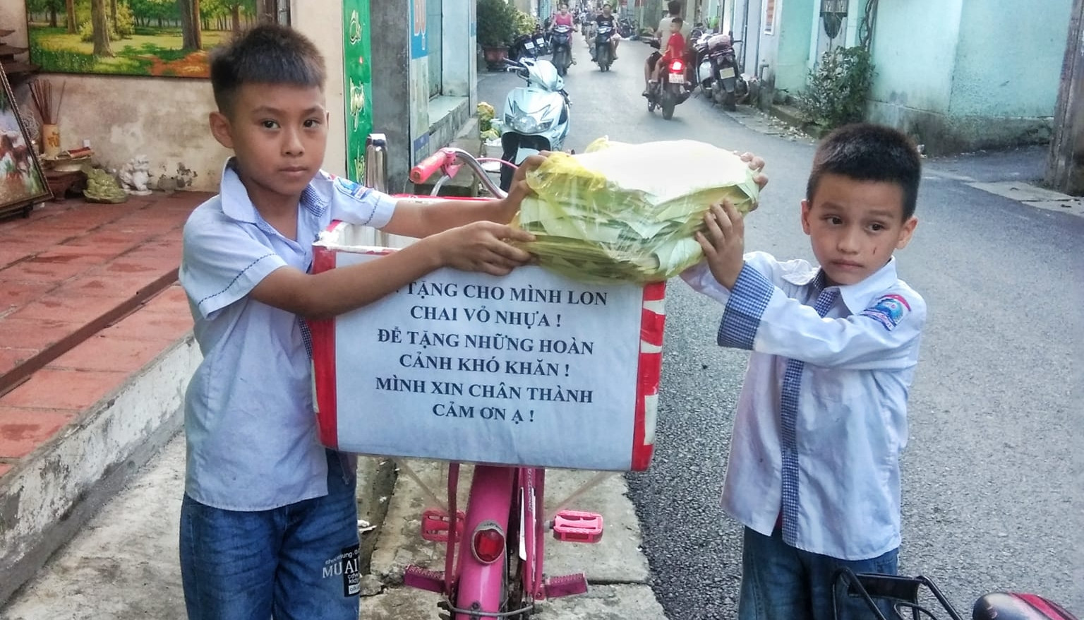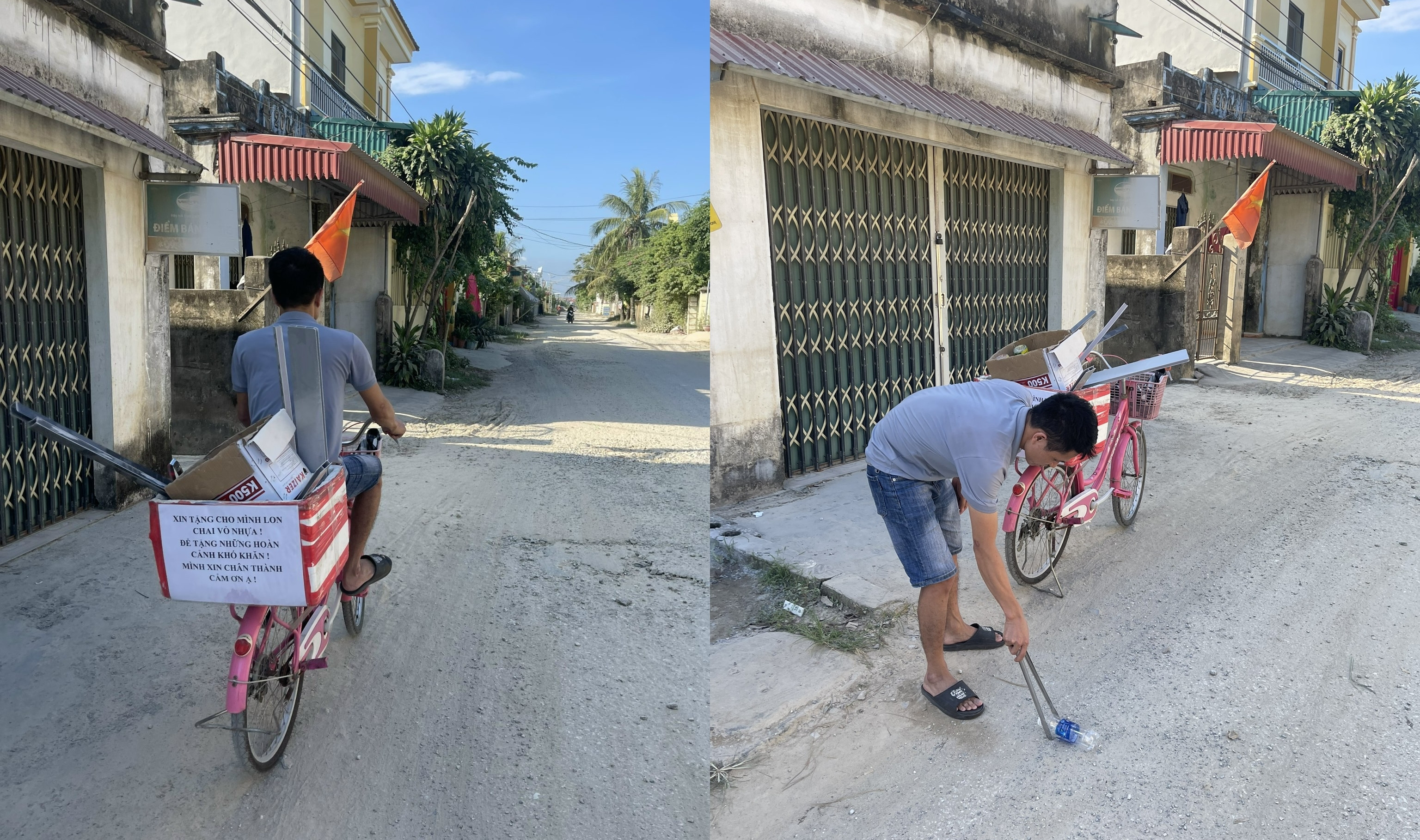 Ngay sau đó, bất chấp mọi sự cười chê, Nam chuẩn bị một chiếc xe đạp cũ. Phía sau xe, anh trang bị thêm thùng xốp có dán mảnh giấy ghi dòng chữ: “Xin tặng cho mình lon, chai vỏ nhựa để tặng những hoàn cảnh khó khăn. Mình xin chân thành cám ơn ạ”.