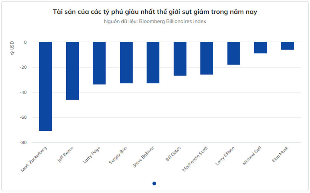 Như vậy, tài sản của Zuckerberg đã bay hơi hơn một nửa. Với khối tài sản trị giá 55,9 tỷ USD, ông đứng thứ 20 trong danh sách tỷ phú toàn cầu, vị trí thấp nhất kể từ năm 2014.