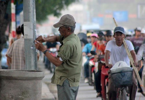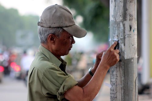 | Mỗi chiều đi tập thể dục, ông Minh đều bóc những tờ giấy quảng cáo, rao vặt dán bừa trên những cây cột điện, mảng tường, điểm chờ xe bus... |