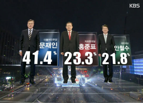 Ông Moon, thuộc đảng Dân chủ, đã nhận được 41,4% phiếu ủng hộ, kết quả tiếp xúc cử tri sau khi rời phòng phiếu do ba đài truyền hình lớn nhất Hàn Quốc là MBC, KBS và SBS tiến hành cho thấy.