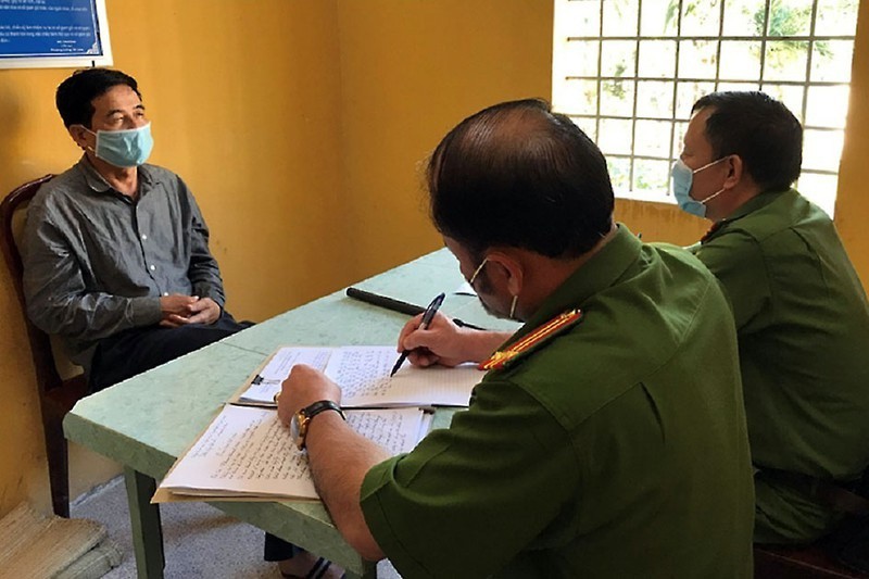 Công an làm việc với "ông trùm" Phan Thanh Hữu, bị can cầm đầu đường dây xăng giả. Ảnh: VH. |