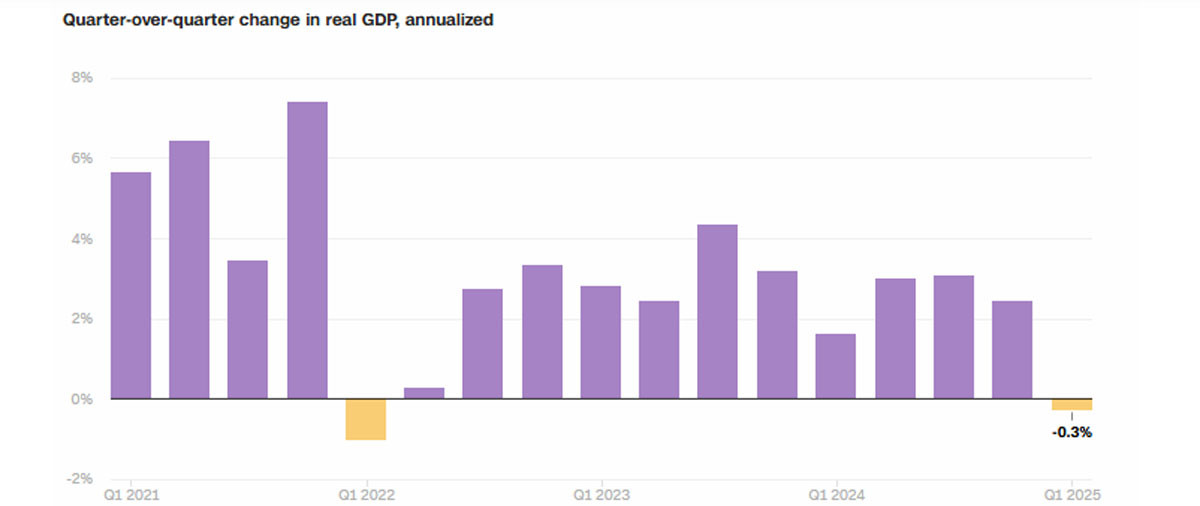 Bộ Thương mại Mỹ tối 30/4 (giờ Việt Nam) cho biết, tổng sản phẩm quốc nội (GDP) trong quý I/2025 ghi nhận mức tăng trưởng -0,3%. Đây là mức giảm mạnh so với mức tăng 2,4% trong quý IV/2024 và thấp hơn nhiều so với mức tăng 0,8% mà các nhà kinh tế dự đoán.
