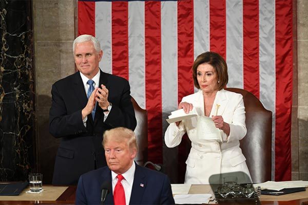 Sau khi ông Trump kết thúc bài diễn văn, Chủ tịch Hạ viện Pelosi đã thẳng tay xé bỏ bản sao Thông điệp liên bang 2020 của tổng thống ngay trên bục chủ tọa.