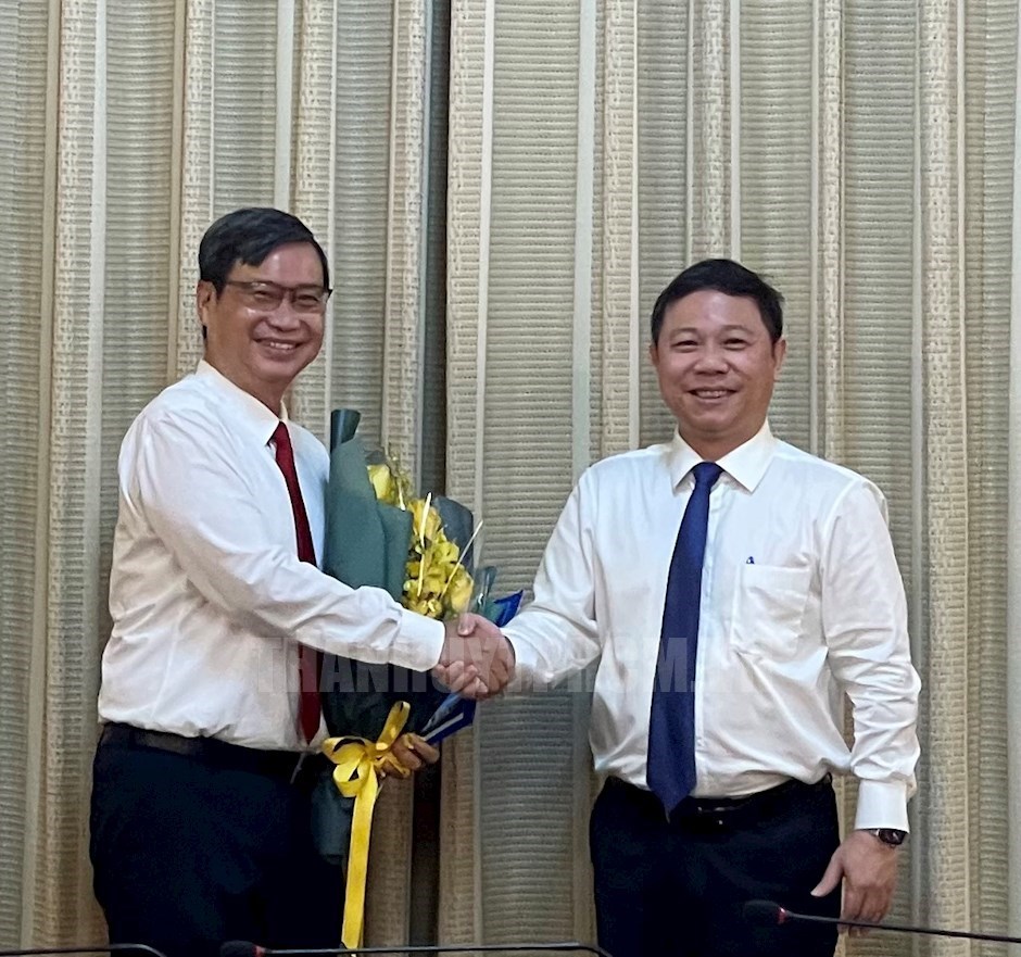 | Đồng chí Huỳnh Cách Mạng, Phó Trưởng Ban Tổ chức Thành ủy trao quyết định của Thành ủy điều động đồng chí Vương Đức Hoàng Quân về Đảng ủy Khối CĐ-ĐH TPHCM (Ảnh: Trang thông tin điện tử đảng bộ TP.HCM) |