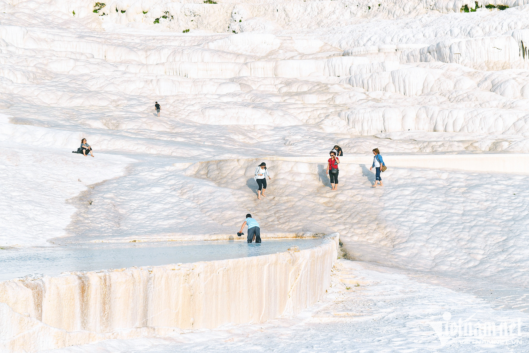 Đặt chân đến khối “bông” khổng lồ này, du khách sẽ cảm thấy thư thái. Càng lên cao, vẻ đẹp của Pamukkale càng trở nên thơ mộng nhờ ánh nắng mặt trời ấm áp.
