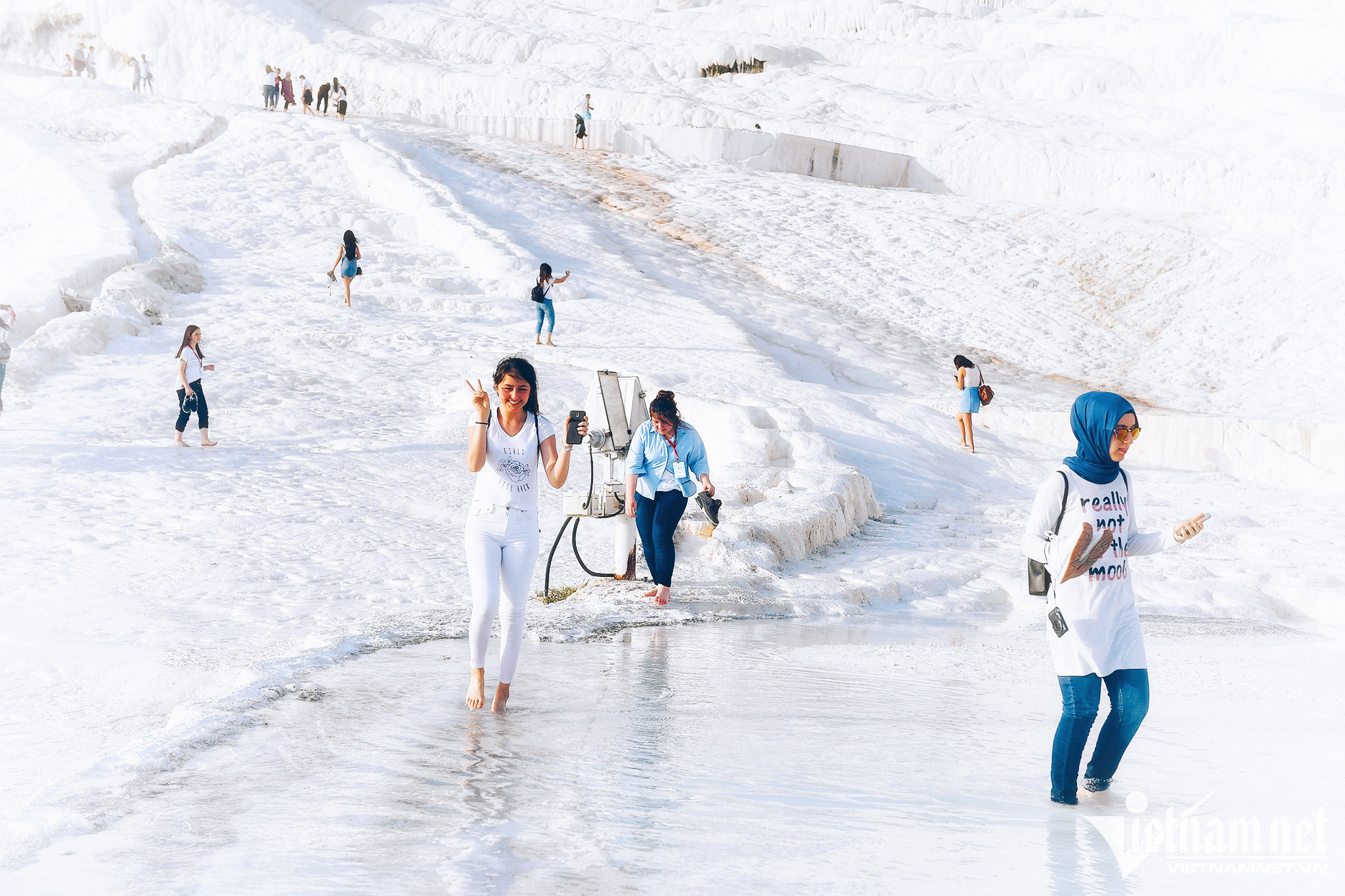 Du khách tới Pamukkale được khuyến cáo chuẩn bị túi để đựng giày dép, quần áo, mũ nón bởi dưới chân mát nhưng phía trên nắng nóng bao phủ dù nhiệt độ chỉ từ 22-33 độ C.