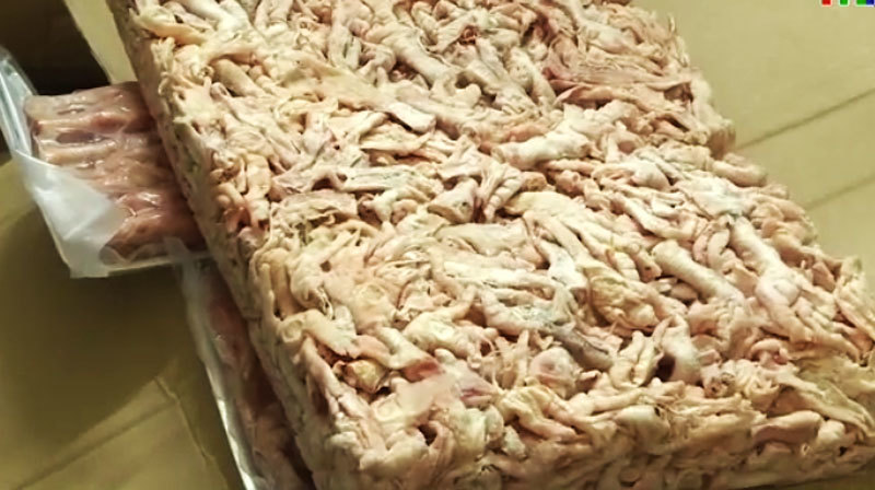 Tại thời điểm kiểm tra kho hàng có chứa nhiều thực phẩm có nguồn gốc từ động vật như chân gà, đùi gà, phao câu gà, xương chân gà,... Toàn bộ số hàng hóa trên có nguồn gốc nước ngoài có tổng trọng lượng khoảng 2 tấn. Chủ kho hàng chưa xuất trình được giấy tờ chứng minh nguồn gốc xuất xứ của lô hàng. Theo trình bày của chủ kho hàng, số chân gà trên được cơ sở mua về sau đó tự rút xương rồi đóng vào thùng các tông của cơ sở, vận chuyển bán đi tiêu thụ tại một số tỉnh lân cận hoặc được xuất đi Trung Quốc.