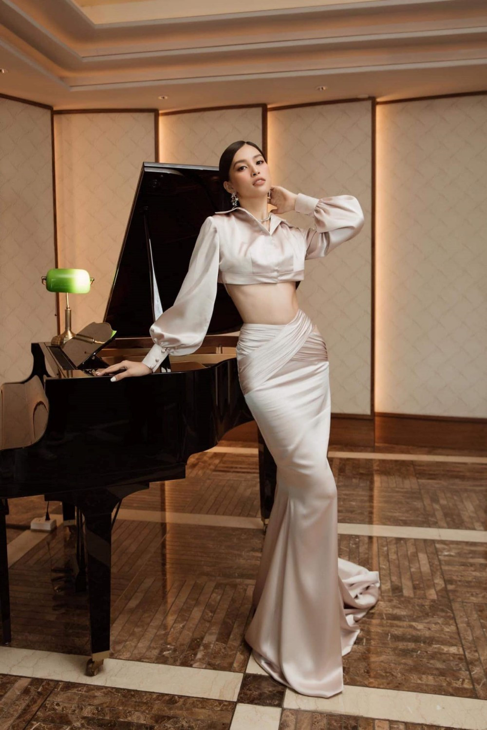 Diện set đồ màu ngọc trai ánh bạc với áo crop-top dáng sơ mi tay bồng, Tiểu Vy khoe khéo được vòng eo thon gọn. Váy đuôi cá ôm sát đã góp phần tôn lên vóc dáng của nàng hậu sinh năm 2000.Đỗ Thị Hà nhẹ nhàng với chiếc váy cúp ngực bồng bềnh, cùng điểm nhấn là đường cut-out phối lưới tôn lên vòng eo. Á hậu Kiều Loan nổi bật với chiếc váy sequin màu bạc lấp lánh, vai vuông quyền lực và xẻ tà cao. Thiết kế đuôi cá màu đỏ cùng chiếc nơ lớn được lồng ghép giúp Phạm Hương tôn lên sắc vóc. Cô chọn kiểu tóc xoăn quen thuộc và màu son đỏ đậm sắc sảo.Á hậu Tú Anh chọn lối make up màu nâu khá Tây, sang chảnh với chiếc váy cocktail màu xanh ánh kim, nơ to bản đính kèm thành tà dài. Hoa hậu Hà Kiều Anh trang nhã trong chiếc váy trắng suông dài, với thiết kế cổ vuông, tay bồng trẻ trung và đường cut-out mảnh hiện đại.