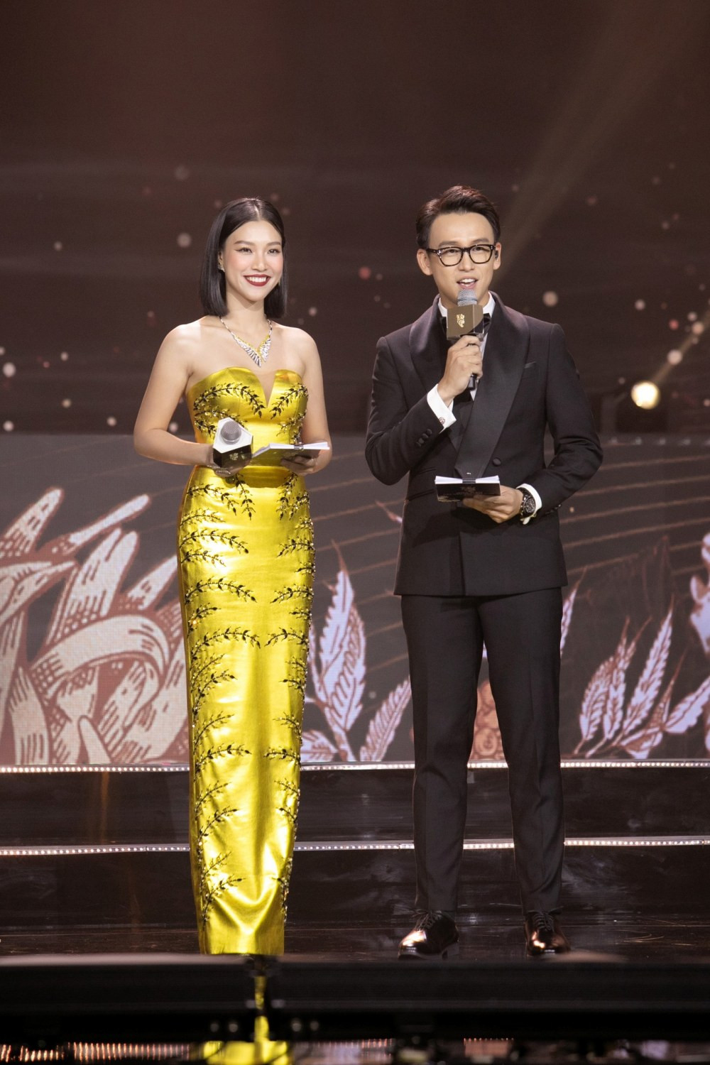 Á hậu Kim Duyên chọn giày cao gót quai ngang, gợi cảm trong chiếc váy lưới đính đá, kết hợp những đường cut-out và đường xẻ. Kỳ Duyên tự tin với thiết kế khoe trọn vòng eo, chọn kiểu tóc đuôi ngựa cá tính để trung hoà. Set đồ màu hồng đậm tôn lên làn da trắng.Á hậu Thuý Vân sải bước trong trang phục mang hơi hướng retro, áo sơ mi hoạ tiết, quần ống rộng tone-sur-tone, khăn turban đồng màu và mắt kính.MC – Á hậu Hoàng Oanh diện váy màu vàng ánh kim với thiết kế suông dài. Trang sức tone vàng – trắng cùng lối trang điểm nhấn vào mắt và môi đầy thu hút.