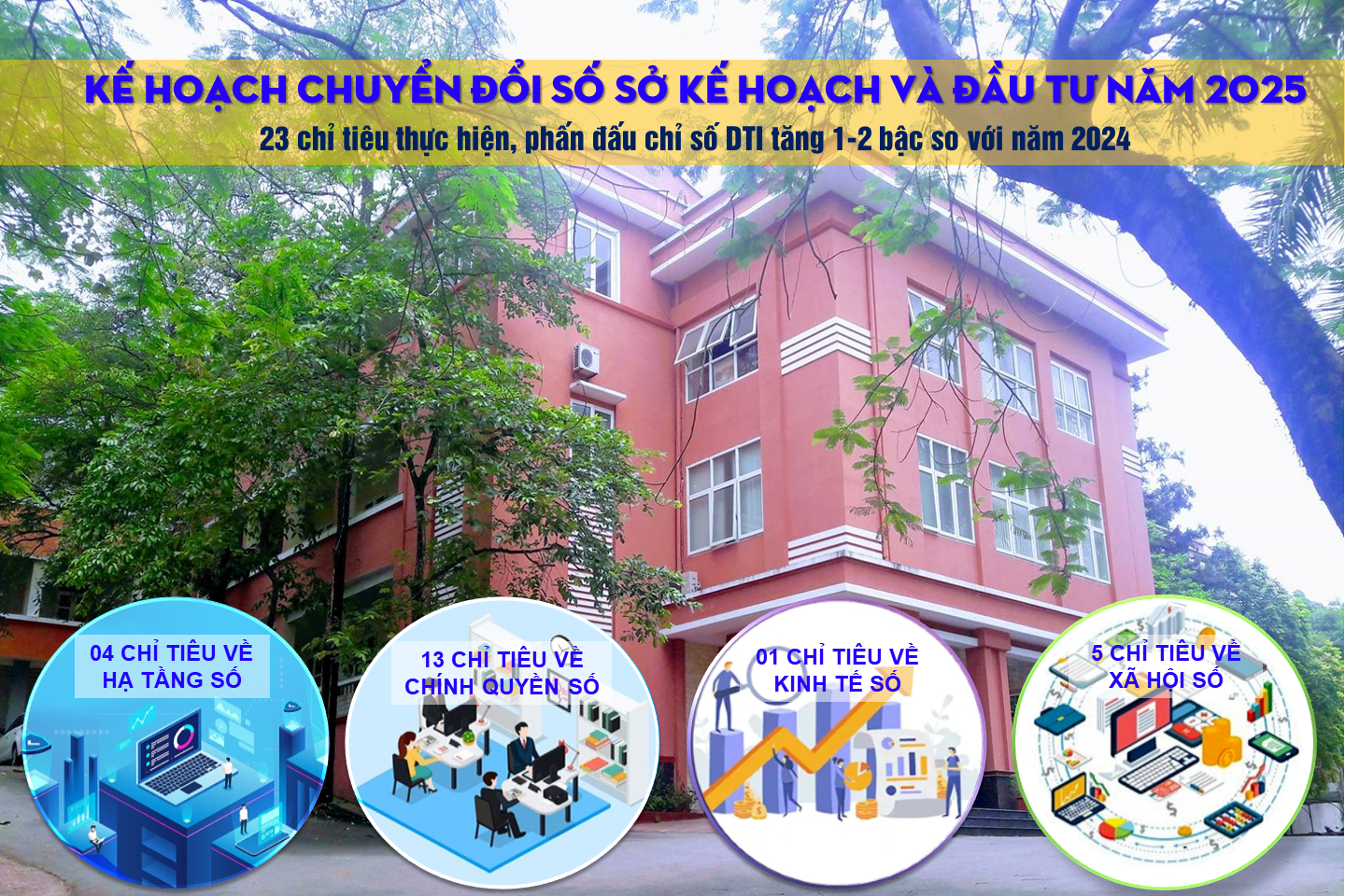 Sở Kế hoạch và Đầu tư xây dựng 23 chỉ tiêu thực hiện. Trong đó có 04 chỉ tiêu về duy trì phát triển hạ tầng số; 13 chỉ tiêu duy trì phát triển chính quyền số; 01 chỉ tiêu duy trì phát triển kinh tế số và 05 chỉ tiêu duy trì phát triển xã hội số.