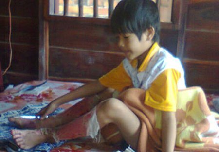 Cháu Đình Thanh và đôi chân bị cha đổ xăng đốt (Ảnh: Pháp Luật TP.HCM) |