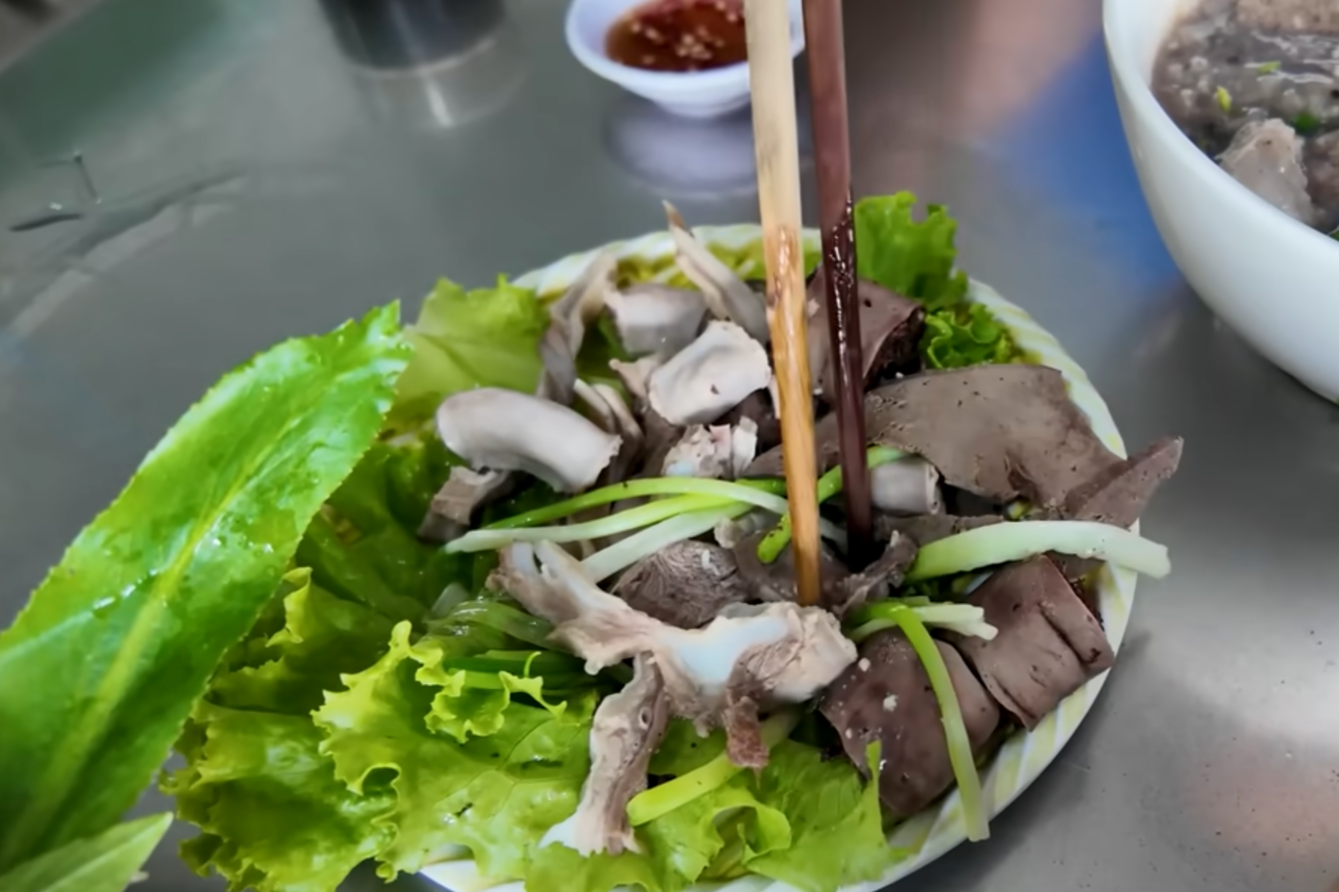 Vợ chồng Chad ăn cháo kèm một đĩa nội tạng luộc có nhiều thành phần như lòng non, lòng già, gan, dạ dày, sụn.