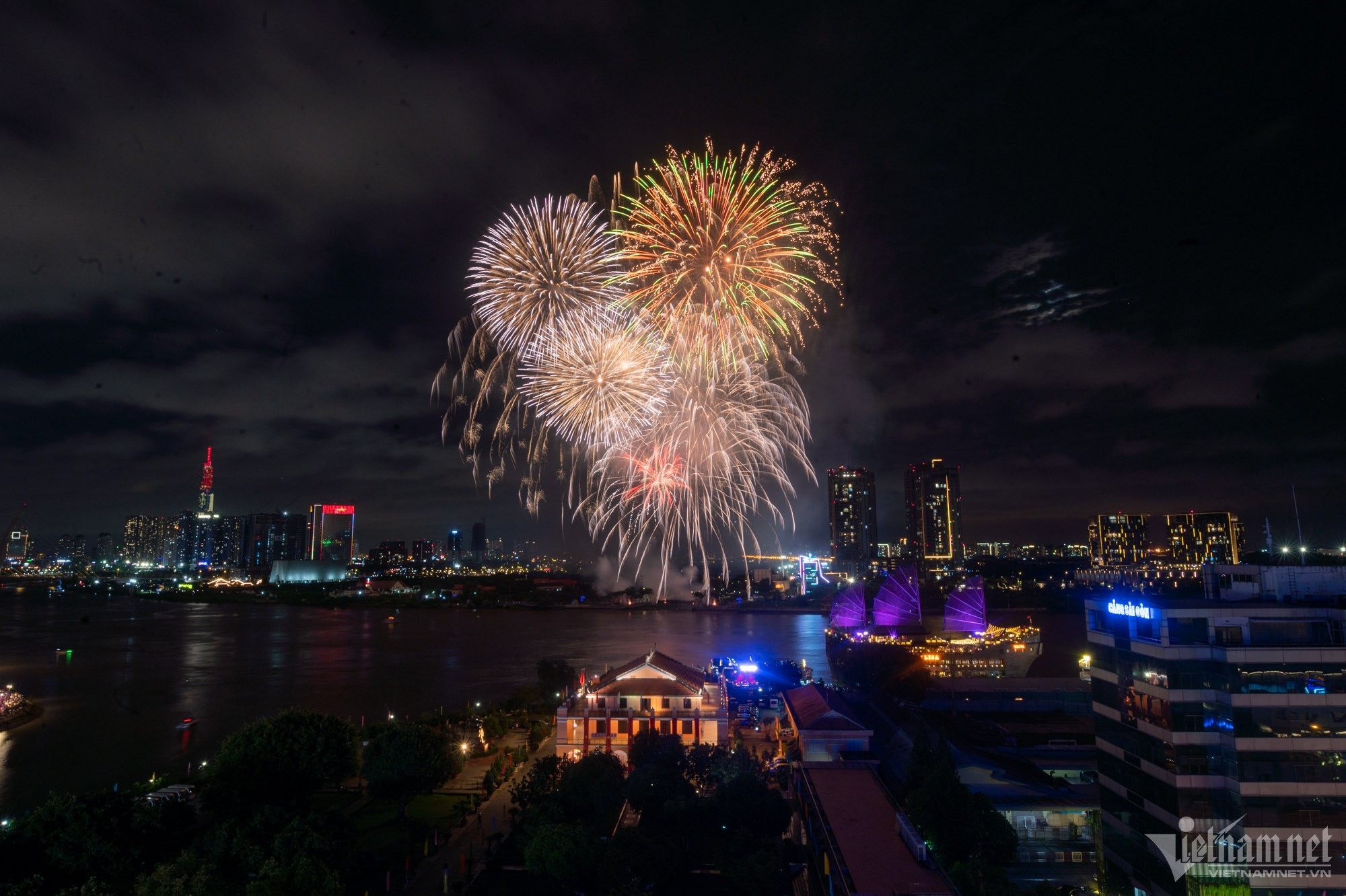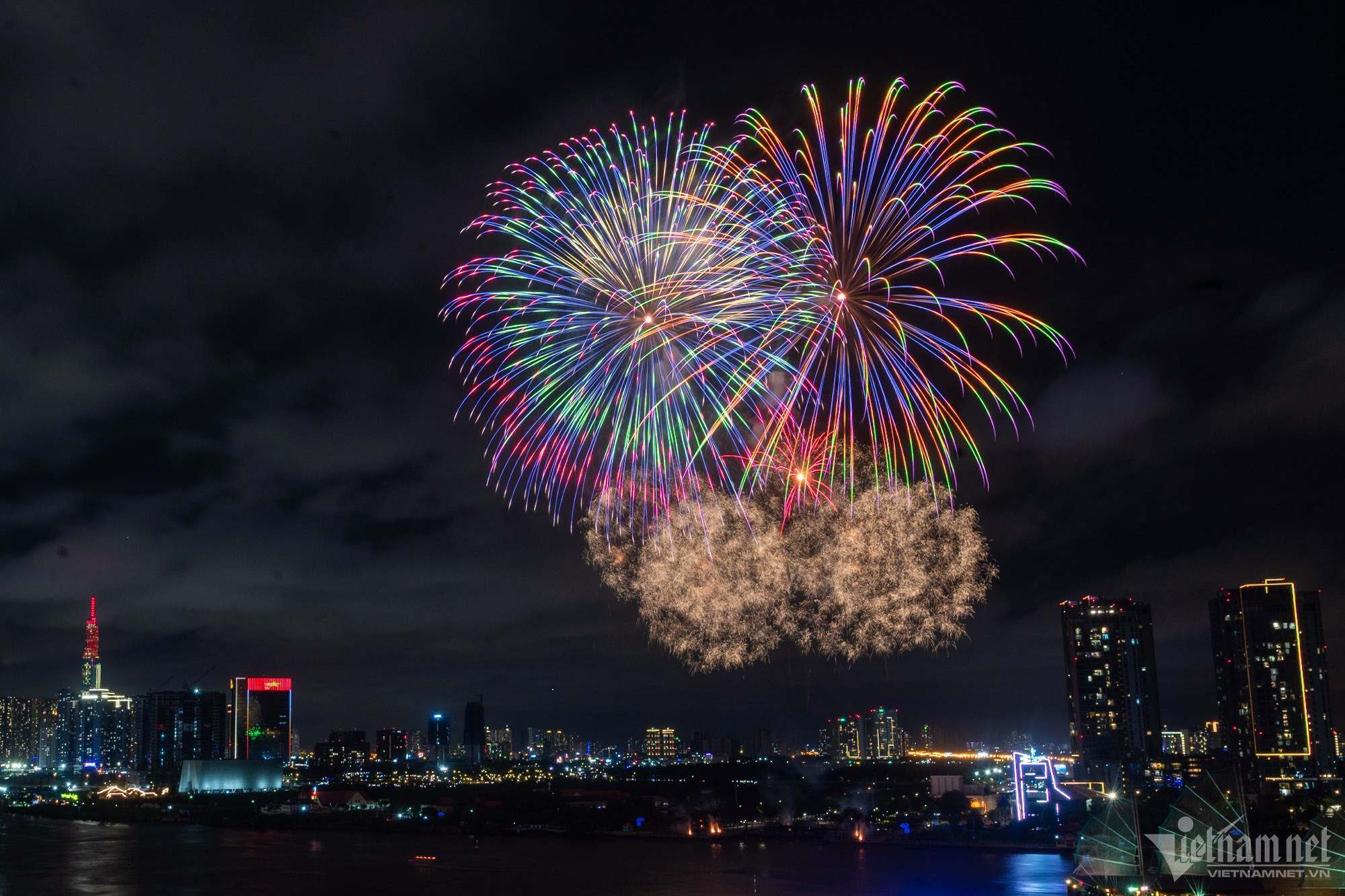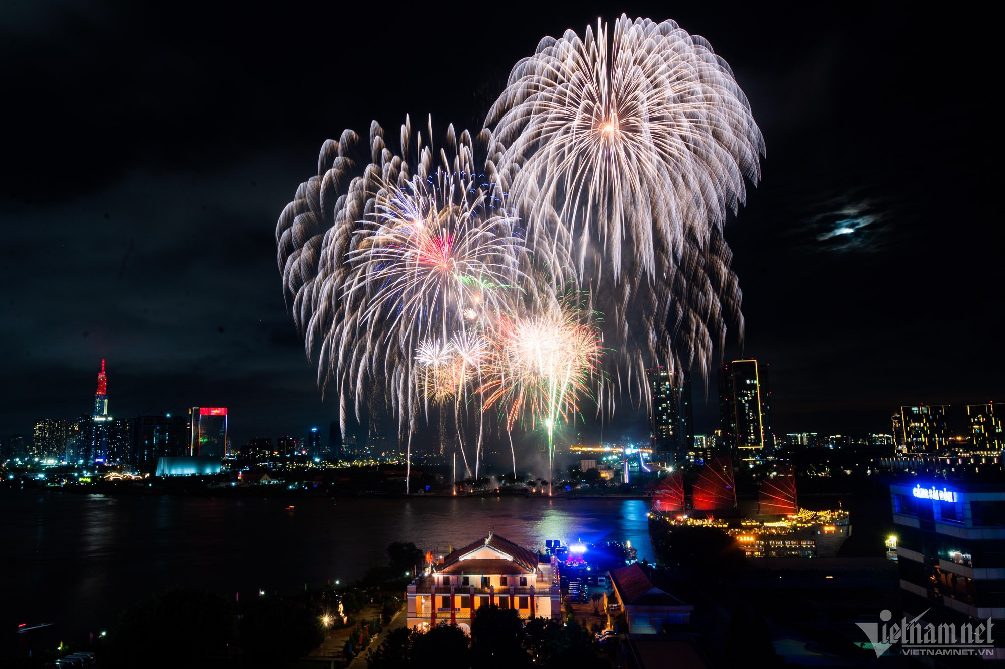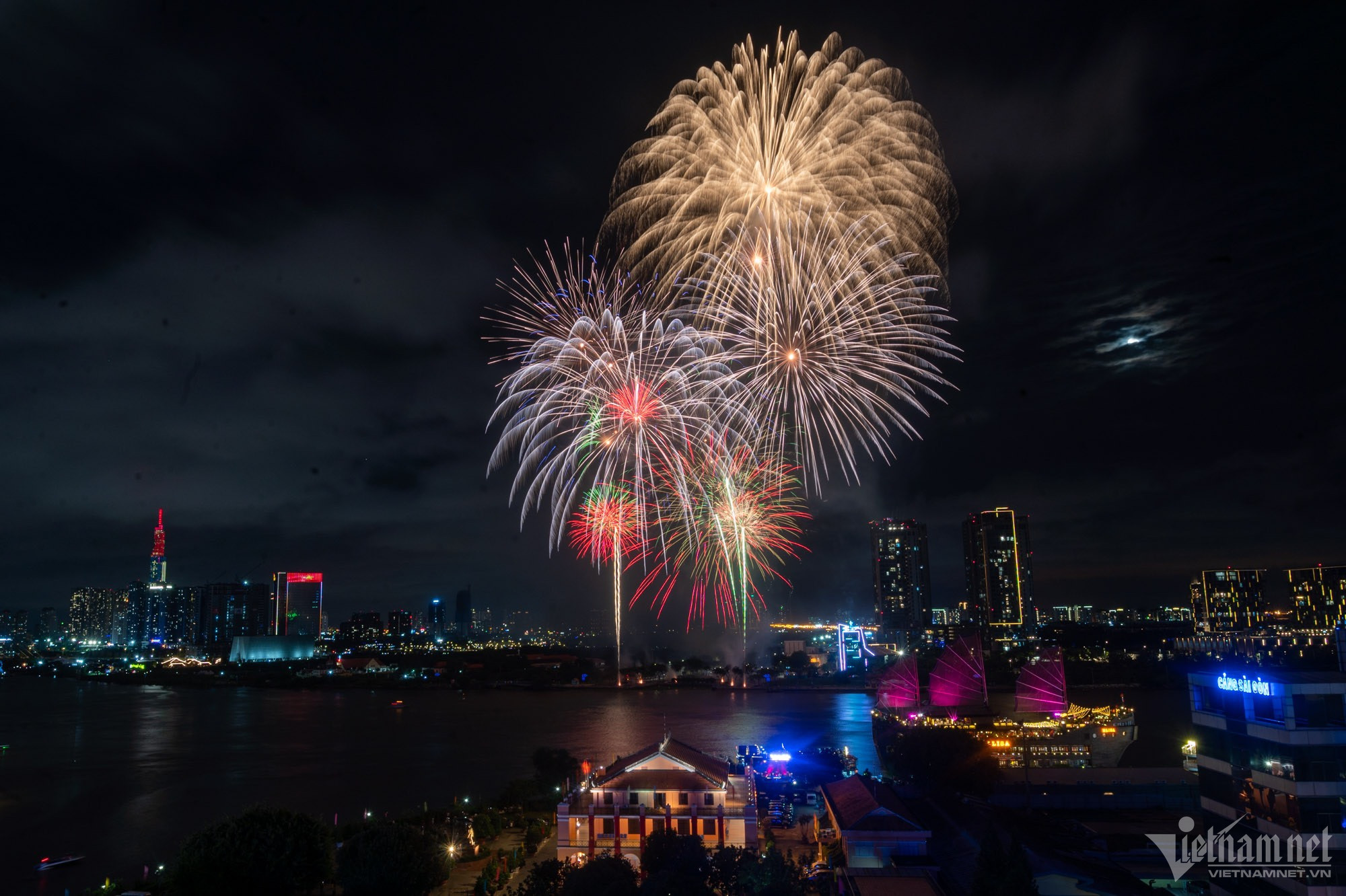 Đúng 21h, lần lượt 1.500 quả pháo hoa tầm cao, 30 giàn pháo hoa tầm thấp và 10 giàn pháo hoa hỏa thuật được bắn lên tại khu vực đầu đường hầm sông Sài Gòn.