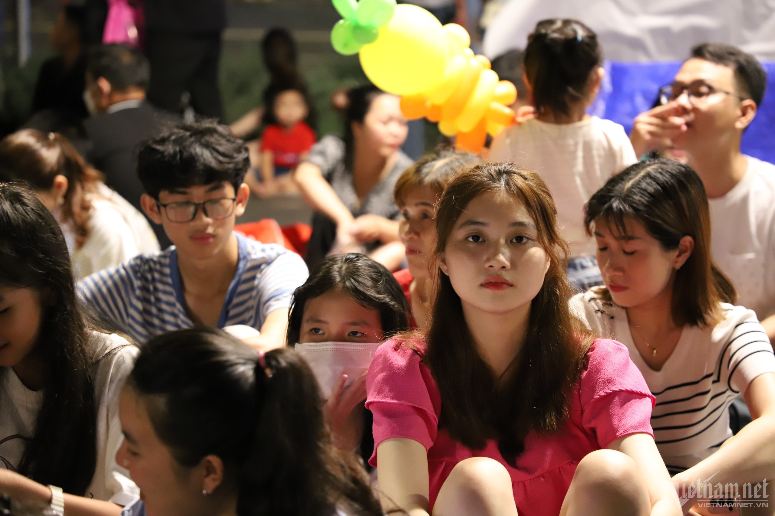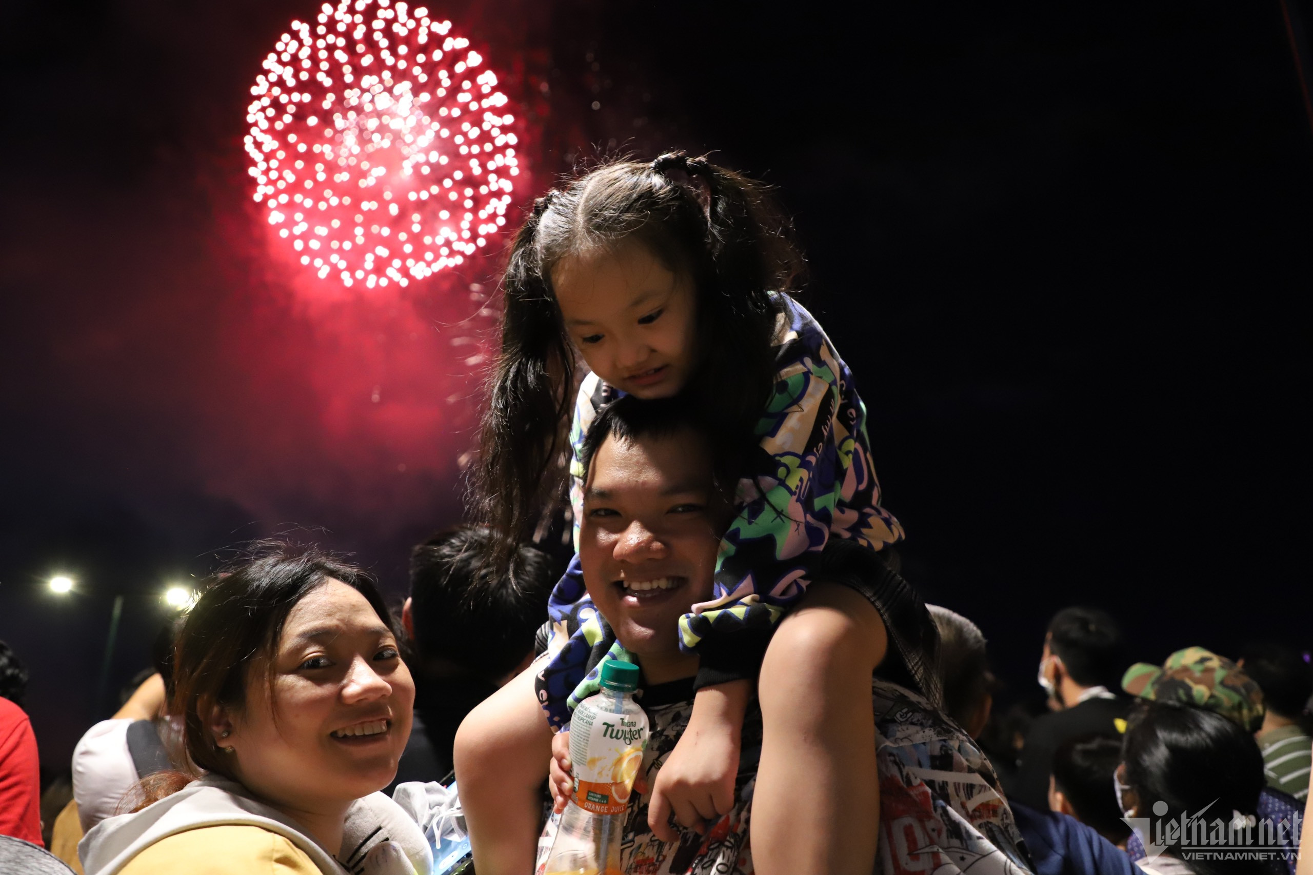 Một cô gái cùng người thân chờ xem khoảnh khắc bắn pháo hoa. Thay vì tìm góc thoáng để đứng, nhiều nhóm thanh niên tìm nơi ngồi nghỉ chân bên bờ kè sông Sài Gòn. Theo ghi nhận, lượng khách đổ về đây phần đông là giới trẻ đang học tập, làm việc tại TP.HCM.
