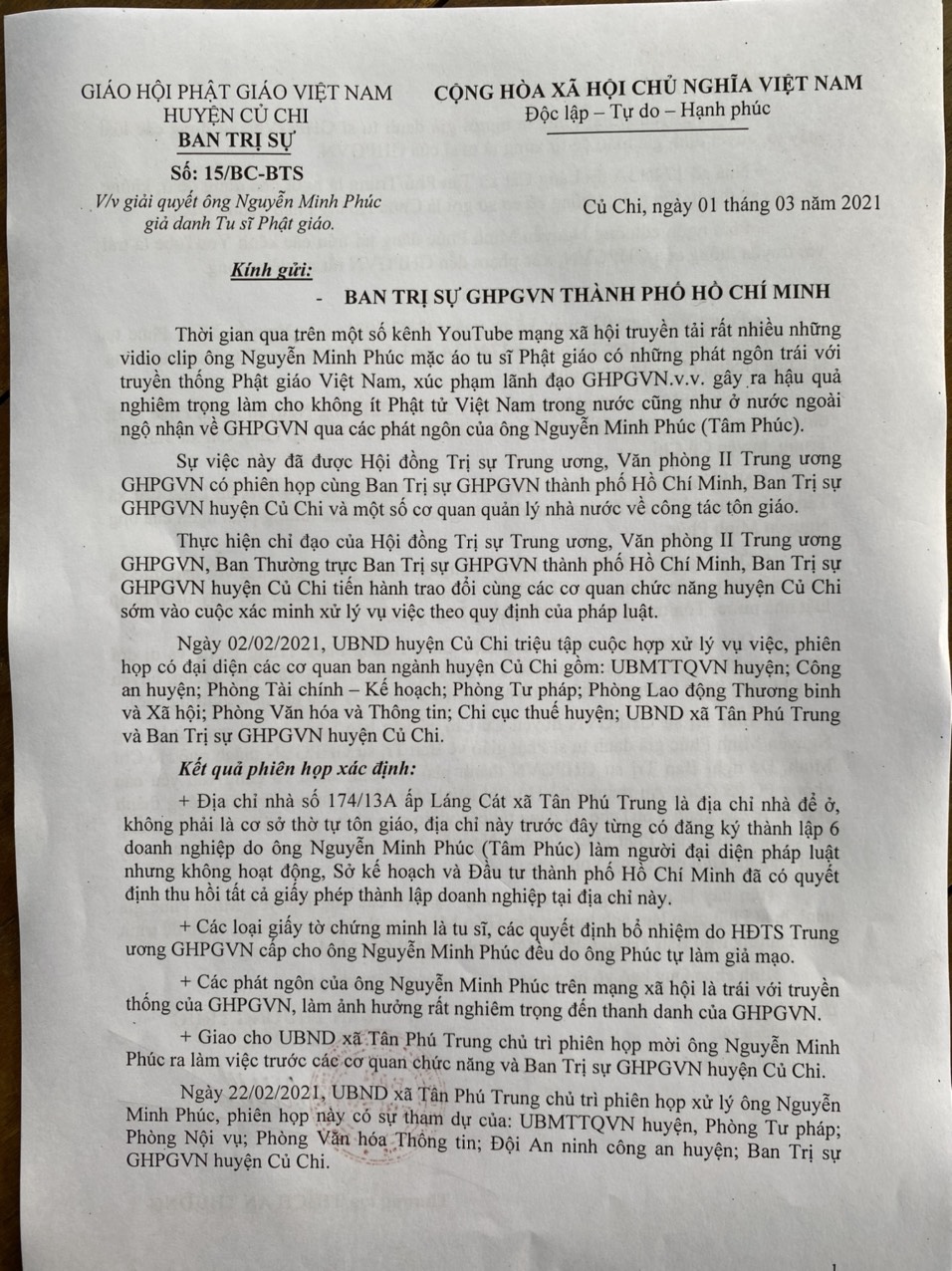 + Ban Trị sự GHPGVN huyện Củ Chi có văn bản báo cáo kết quả xử lý ông Nguyễn Minh Phúc giả danh tu sĩ Phật giáo về Ban Trị sự GHPGVN thành phố Hồ Chí Minh. Đề nghị Ban Trị sự GHPGVN thành phố Hồ Chí Minh có công văn yêu cầu phòng PC.05 Công An thành phố Hồ Chí Minh, Sở Thông tin và Truyền thông thành phố xử lý các kênh YouTube đã đăng tải các video clip phát ngôn trái với truyền thống Phật giáo, xuyên tạc Phật giáo của ông Nguyễn Minh Phúc. Tất cả các video clip này phải tháo gỡ khỏi các trang YouTube.