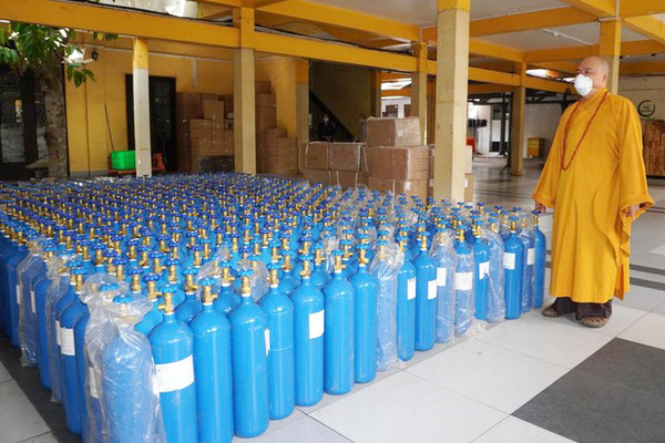 Hôm 26/9, Ban Từ thiện - Xã hội Phật giáo TP. HCM đã trao tặng 600 bình oxy loại 9 lít cùng 5.000 bộ bảo hộ y tế cho tỉnh An Giang tại chùa Vĩnh Nghiêm (quận 3).