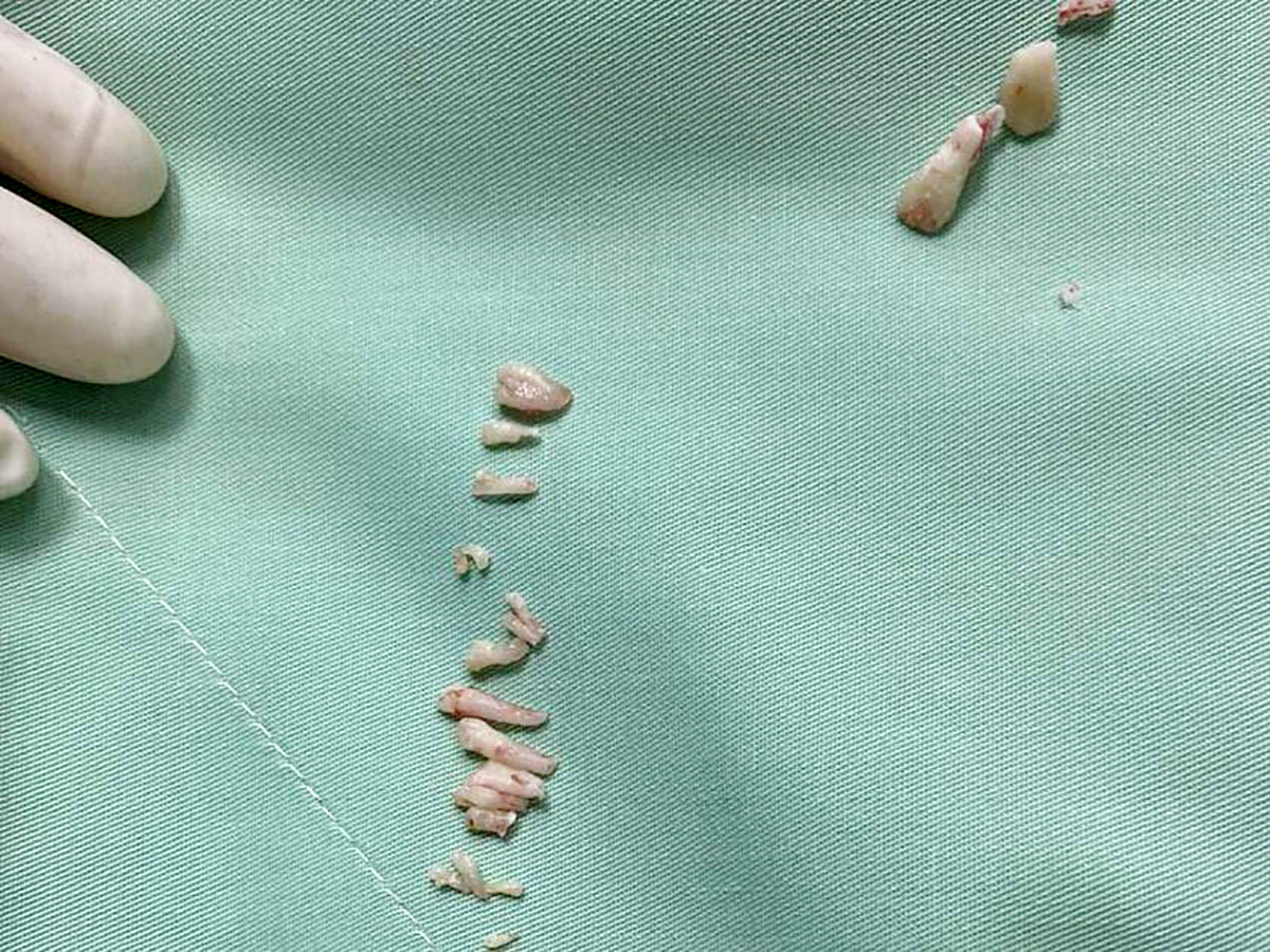 Nữ bệnh nhân nhập viện ngày 9/2. Sau khi thăm khám, bác sĩ phát hiện khối u răng ở hàm dưới nên đã quyết định phẫu thuật. Từ khối u có kích thước 2x3 (cm), các bác sĩ đã gắp bỏ khoảng 30 chiếc răng to, nhỏ khác nhau.