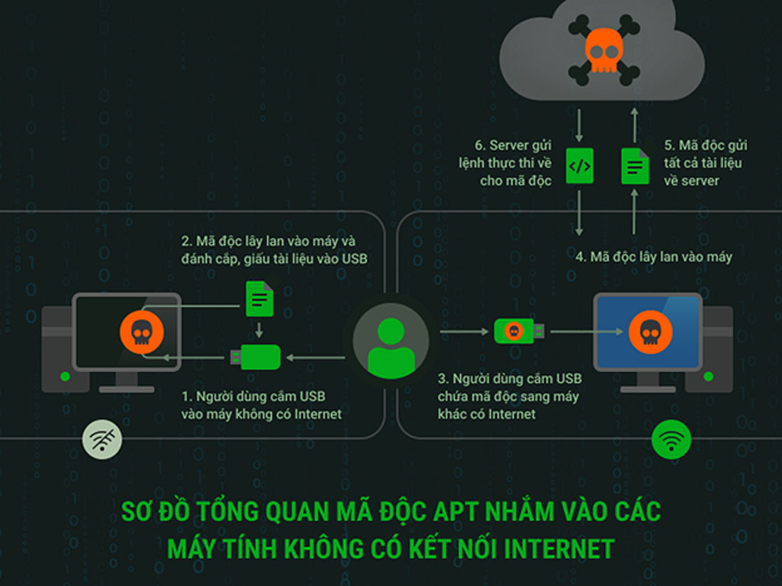 Thực tế, hacker hoàn toàn có thể tấn công máy tính không kết nối Internet, lợi dụng nguyên lý mọi thiết bị điện tử đều phát ra sóng điện tử để ăn trộm thông tin. Một số chiến dịch tấn công bằng mã độc phát tán qua USB, CD... bằng hình thức quà tặng, khuyến mãi nhằm mục đích đánh cắp thông tin, dữ liệu.