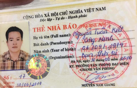 Mặt trước thẻ được in là thẻ nhà báo mang tên Nguyễn Tuấn Kiệt với bút danh Công Minh. Thẻ này có chữ ký ngày 30/6/2016 của Chánh văn phòng mang tên Nguyễn Nam Giang. Thẻ đề có giá trị đến ngày 30/6/2019.