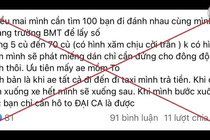 Trước đó, ngày 24/3, V.T.H. sử dụng tài khoản Facebook cá nhân đăng tải bài viết với nội dung: "Thuê 100 người đi đánh nhau cùng mình để lấy số tiền công 5 triệu đồng đến 70 triệu đồng”.