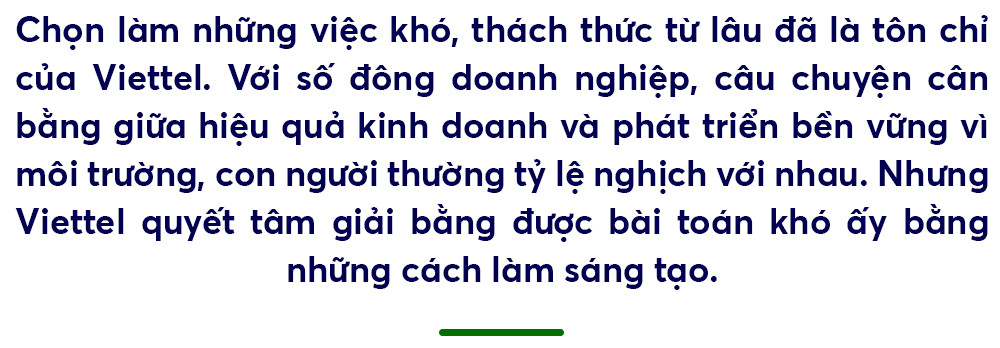 Thực tế, nhiều tổ chức vẫn nhìn nhận chuyển đổi xanh đem lại hiệu quả tốt về mặt dài hạn, nhưng sẽ tốn kém và làm giảm hiệu quả kinh doanh trước mắt. Trong bối cảnh ấy, Viettel lựa chọn định hướng xanh chính là chiến lược phát triển “một mũi tên trúng hai đích”: Vừa tăng hiệu quả, nâng cao sức cạnh tranh và khác biệt trong cả ngắn và dài hạn; vừa giảm thiểu chi phí.