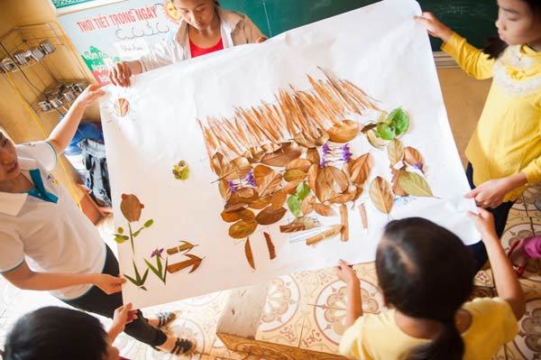 Bình thường, lá cây khô được coi là rác. Nhưng với cách tiếp cận của dự án, những chiếc lá rơi đầy sân trường này lại trở thành học liệu hấp dẫn các em sáng tạo. |