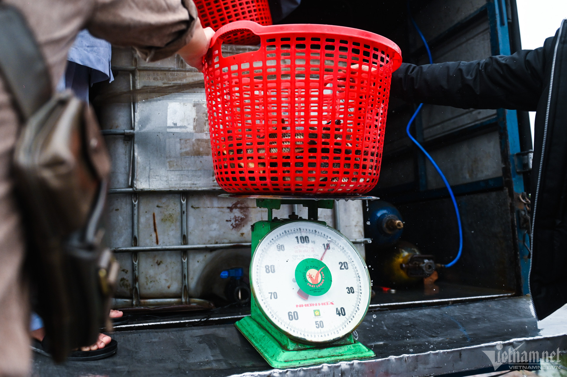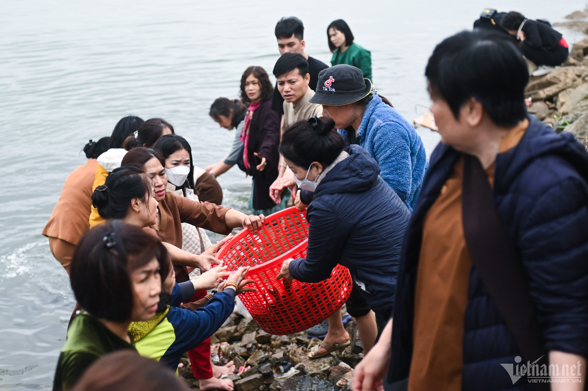 8h30, các phật tử di chuyển ra khu vực đình Bát Tràng nằm ven sông Hồng để thực hiện nghi thức phóng sinh đầu năm. Những giỏ cá bắt đầu được chuyển từ trên ô tô xuống các bậc thềm ra tới bờ sông.
